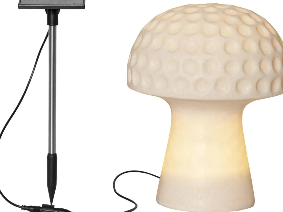 Sandy 24cm solcellsbelysning från Star Trading är en liten svamp gjord av sandstone. Sandstone är en blandning av sand och resin detta gör att vissa färgvariationer och grovlek i sanden kan förekomma. Själva solcellspanelen sitter på enkabel 70 centimeter från sandy vilket möjliggör att ha dekorationen i skuggan och samtidigt ha panelen i solen så att den kan laddas.