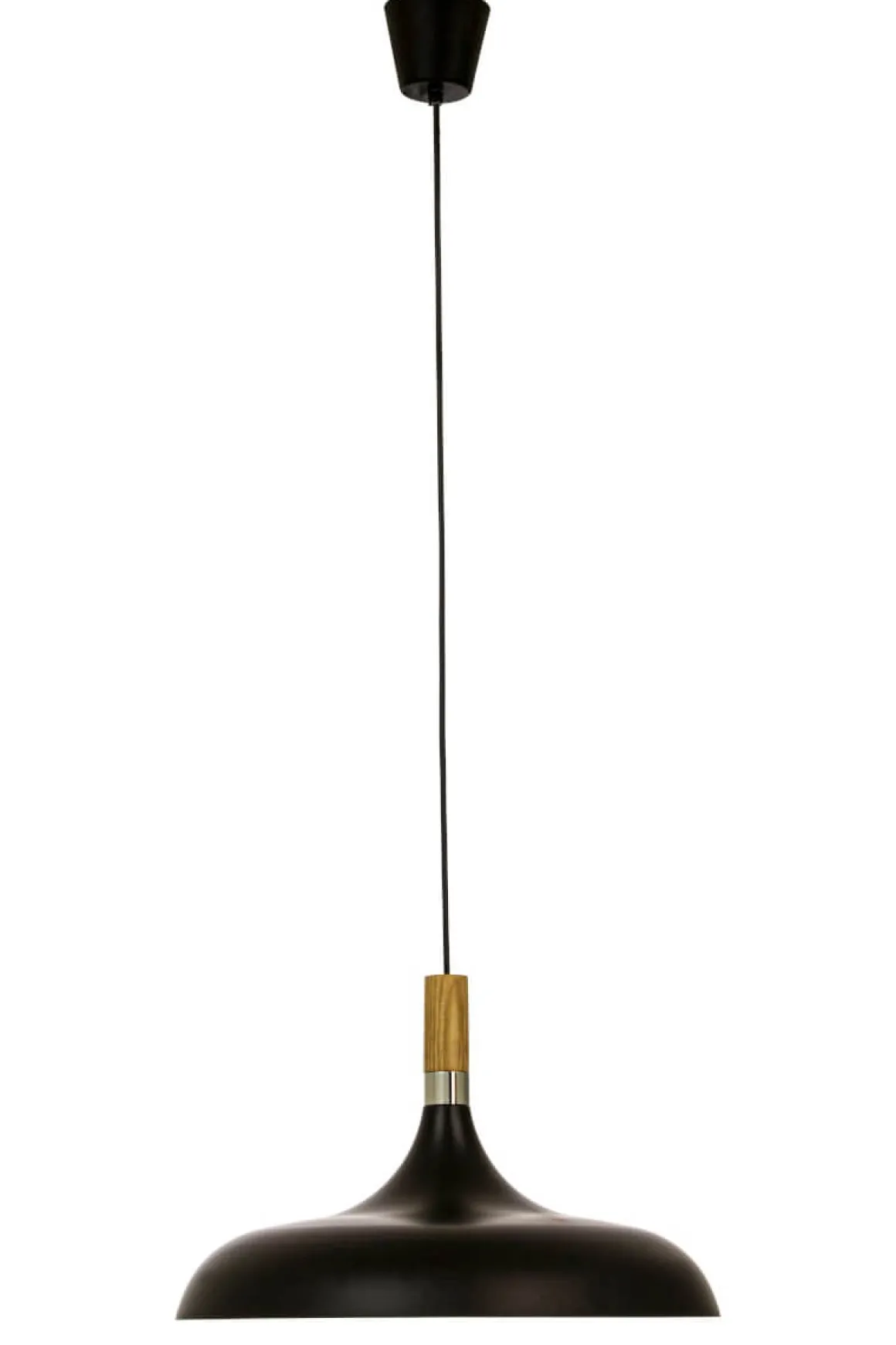Vacker taklampa med mjuka former med en härlig kombination av svart/trä och krom. Perfekt som matbordslampa.