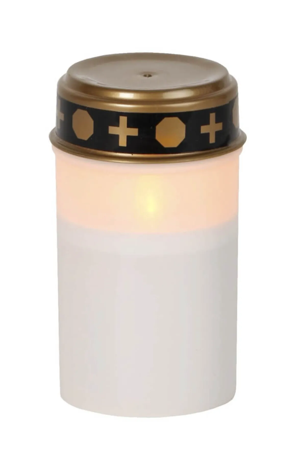 Ett vackert gravljus i färgen vit med antikfärgat lock ljuset lyser med ett varmt och fint sken som i mörkret. Ljuset är 12 cm högt och drivs med två AA batterier. Den inbyggda timern är perfekt för att ställa in när ljuset ska lysa.