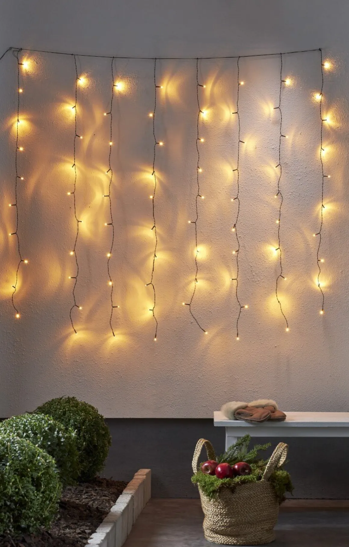 Gardinslinga med 80 LED lampor med vackert gyllene ljussken från star trading. Gardinen har en storlek av 1,3×1,3m. Perfekt för dekoration i din trädgård eller på huset.