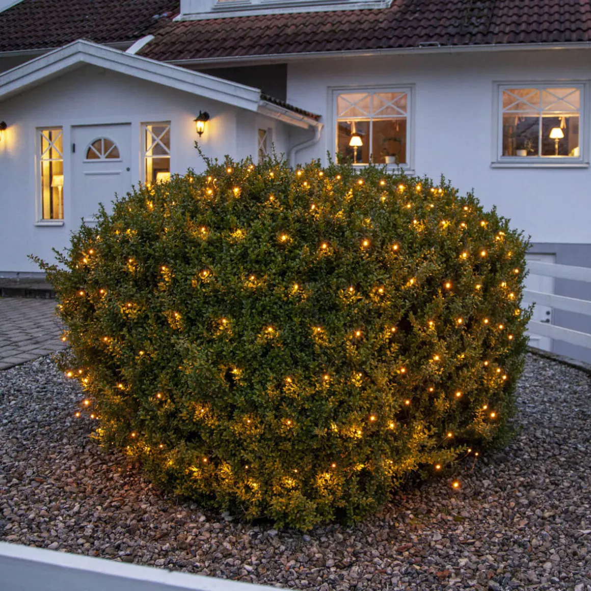 Nät från star trading med 160 LED lampor med vackert gyllene ljussken. Nätet har en storlek av 2×2 m. Perfekt att dekorera buskar med.