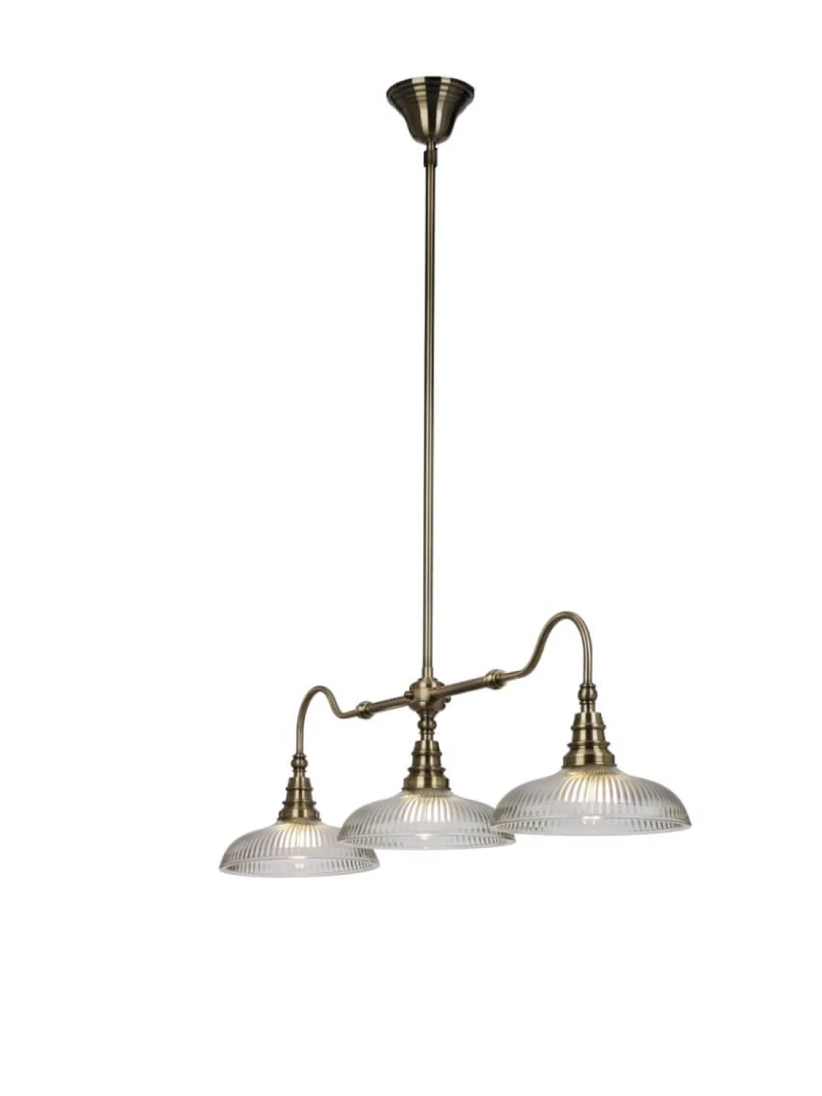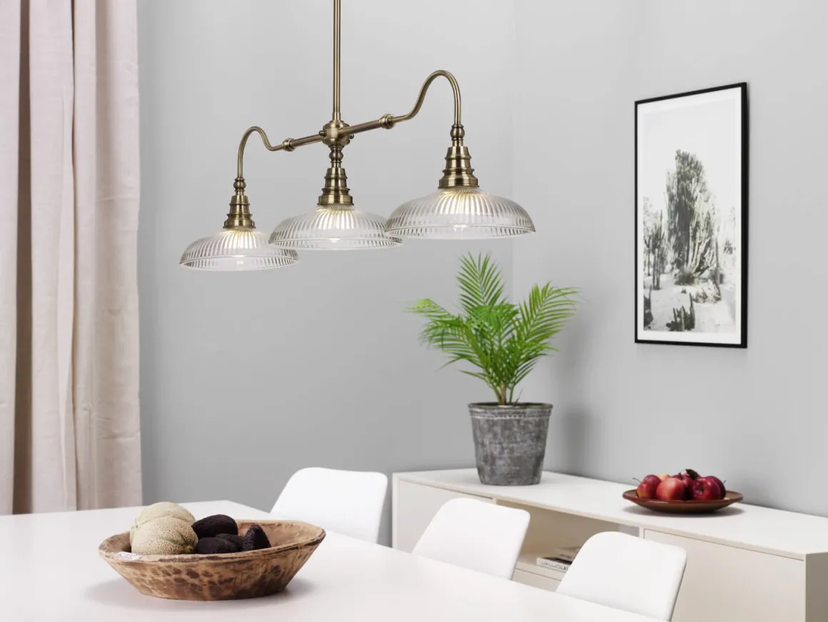 Vacker taklampa i gammal stil men med ett modernt intryck. Snooker har en stomme i antikfärgad metall ljuvligt kombinerad med räfflade kupor i klarglas. Krokupphäng? Självklart – för en snabb och smidig installation.