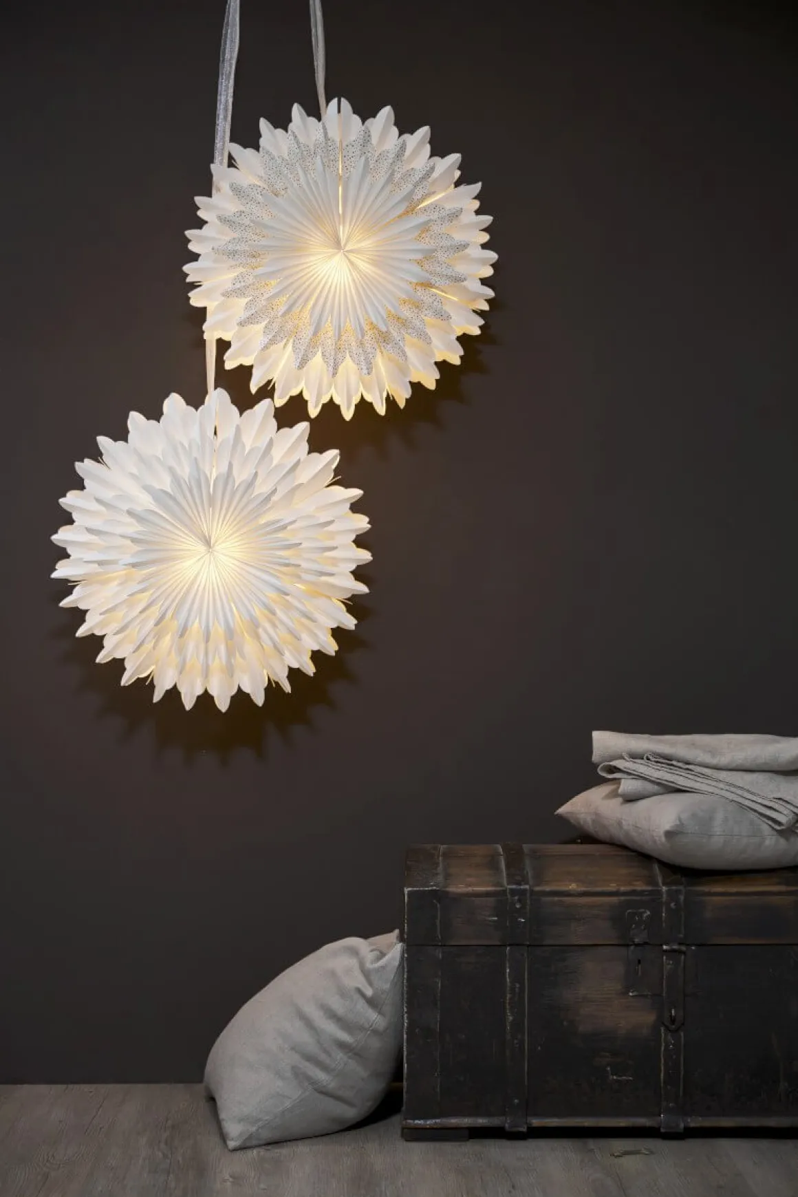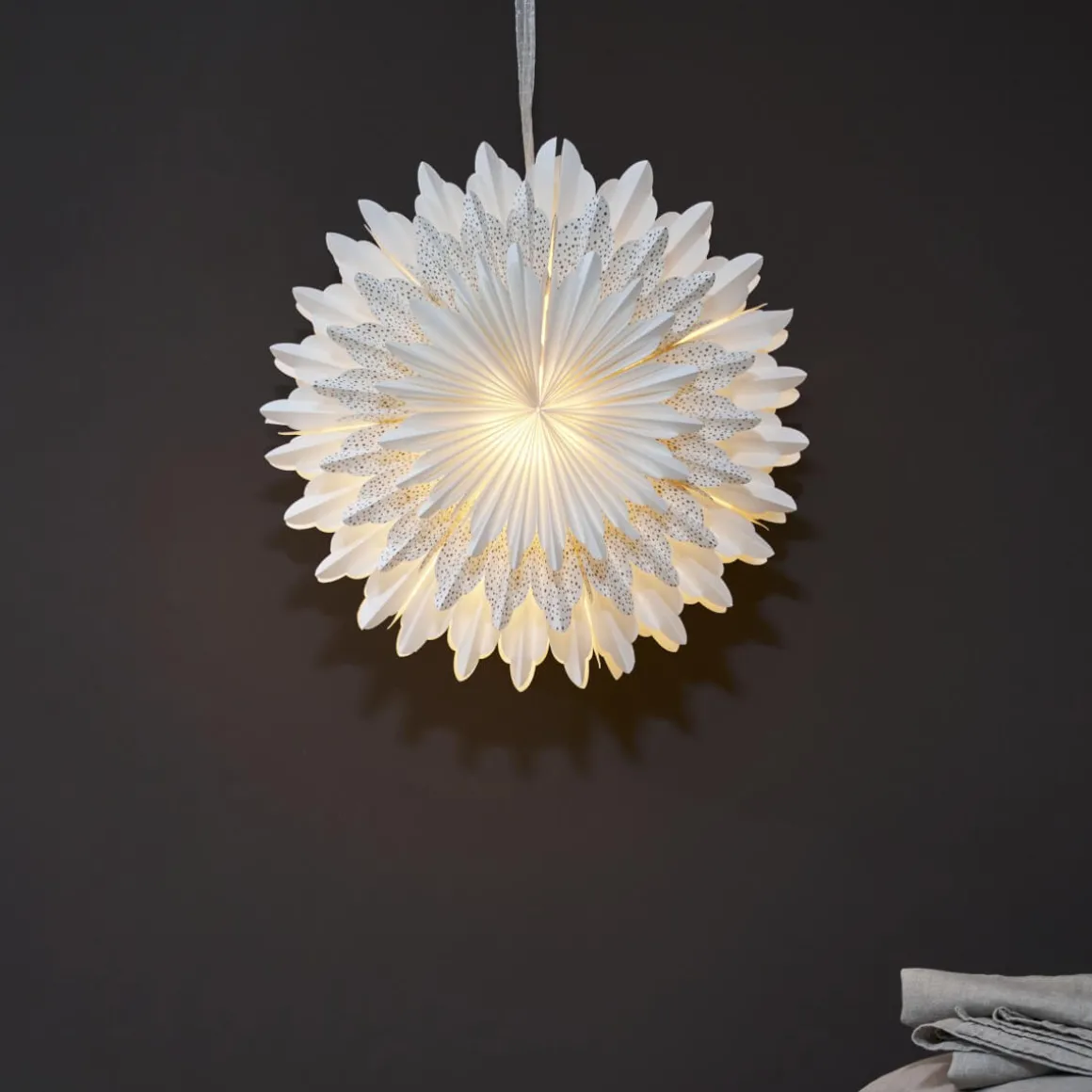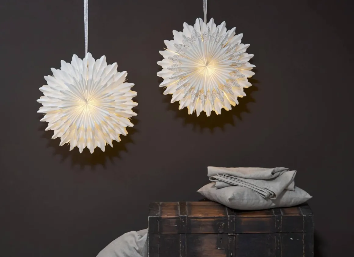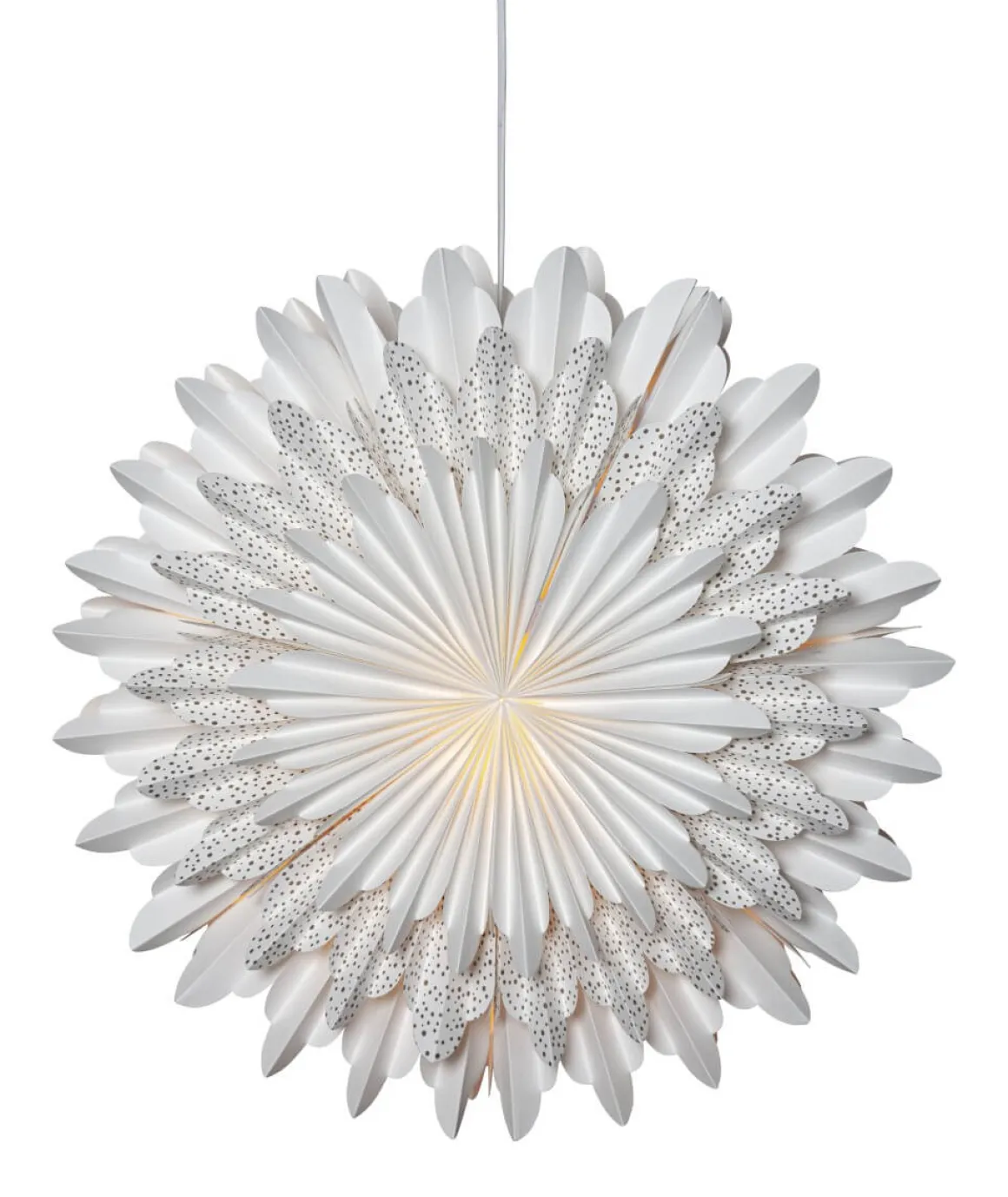Vacker vit pappersstjärna med guld prickar på det mellersta lagret. Stjärnan har tre lager veckat papper som ger en härlig effekt. Ett elegant band ingår för att lättare kunna hänga upp stjärnan. Stjärnan sprider mysig stämning och ger hemmet den där speciella julkänslan. Kan hängas både i fönster och mot en vägg. sladdställ och ljuskälla ingår ej.
