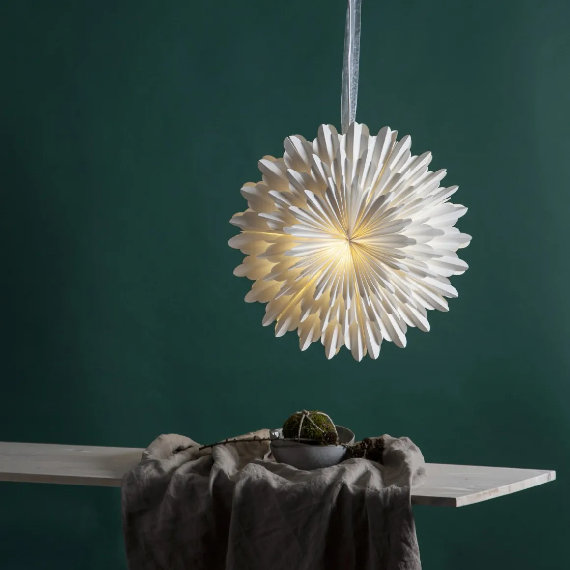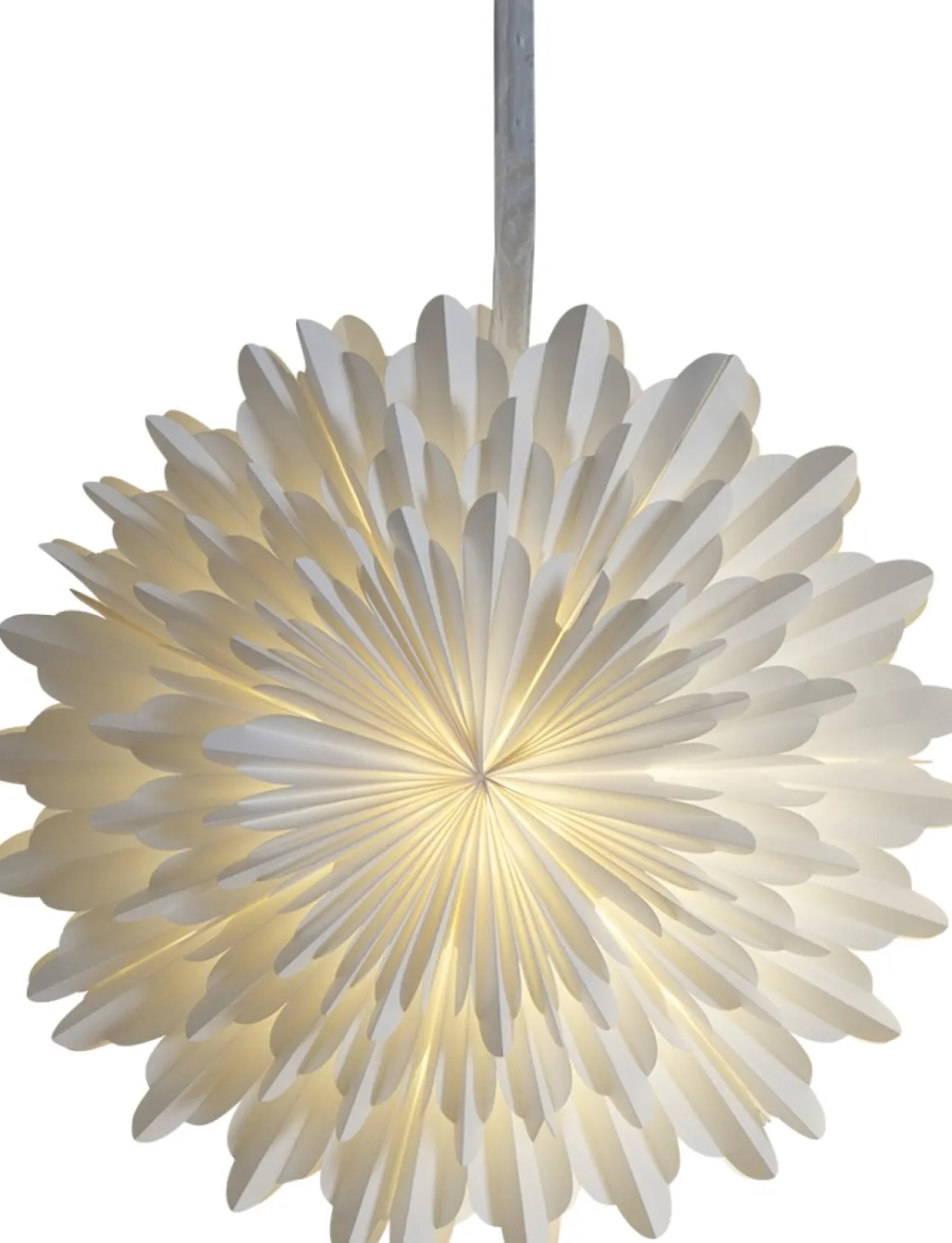 Vacker vit pappersstjärna från Star Trading som är tillverkad av tre lager veckat vitt papper. Ett elegant band ingår för att lättare kunna hänga upp stjärnan. Snow sprider stämning och ger hemmet den där speciella julkänslan. Kan hängas både i förnster och mot en vägg. (obs! sladdställ köpes separat)