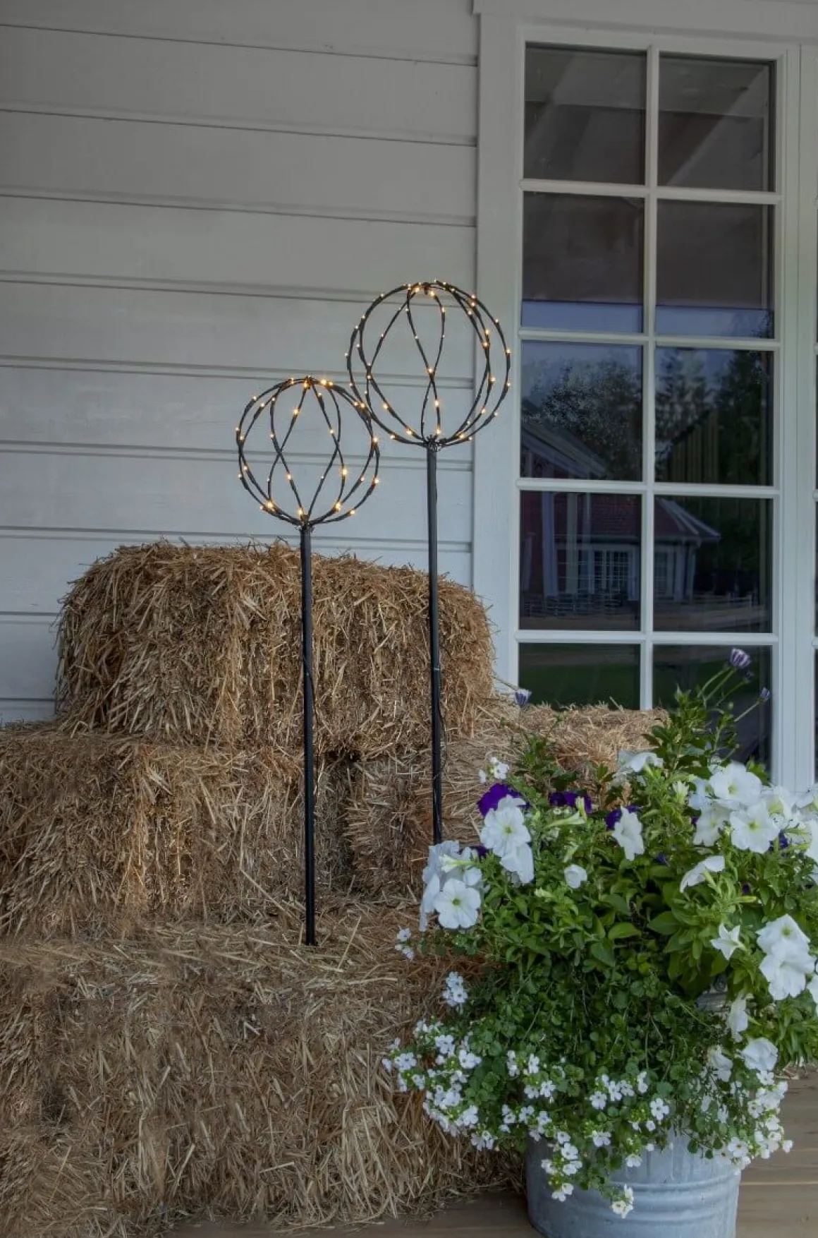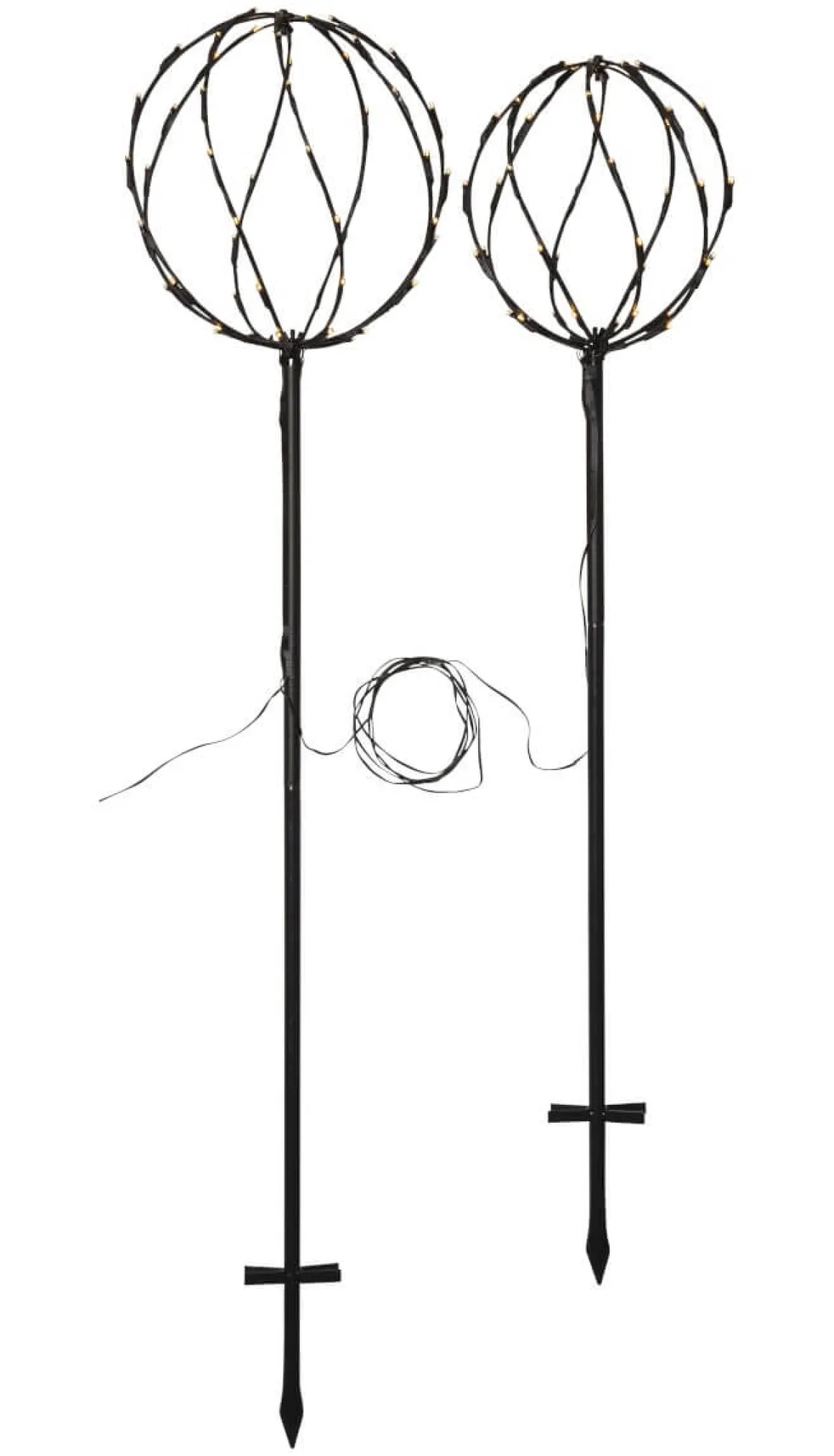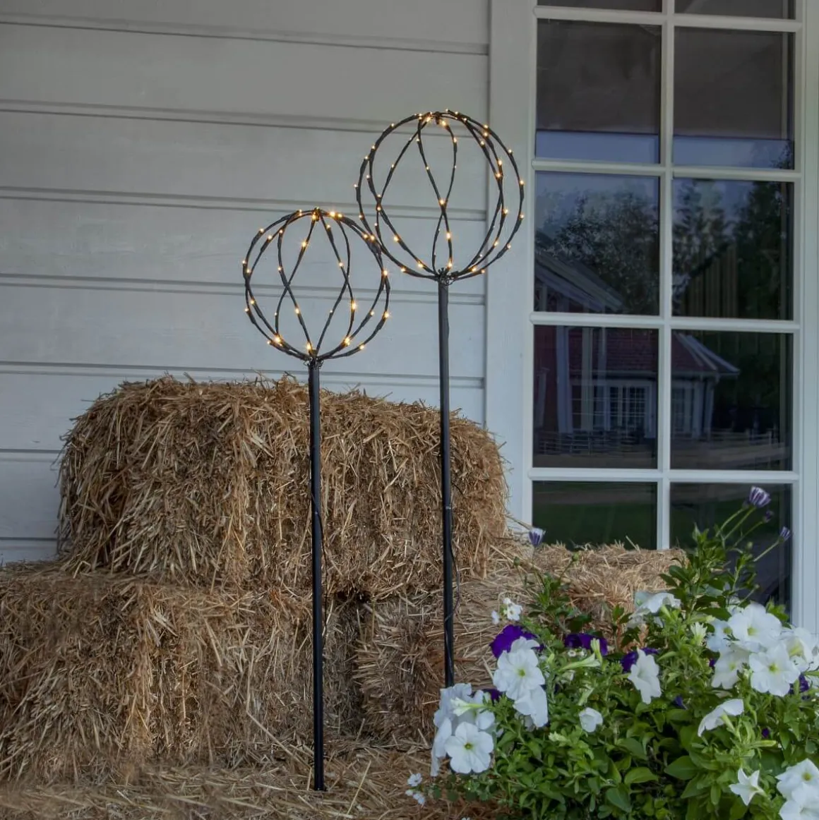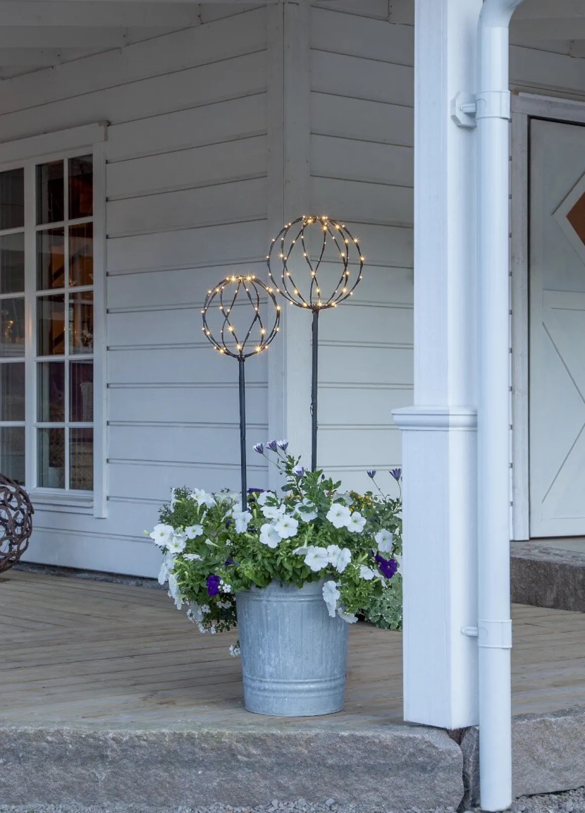 Så vacker utomhusdekoration från Star Trading. Sphere är ett set med 2 stycken sammankopplade bollar på spjut som du enkelt trycker ner i jorden eller i en blomkruka. Höjden på pinnarna är 130 cm och 110 cm och kabeln som är dem emellan är på 2,5 meter.