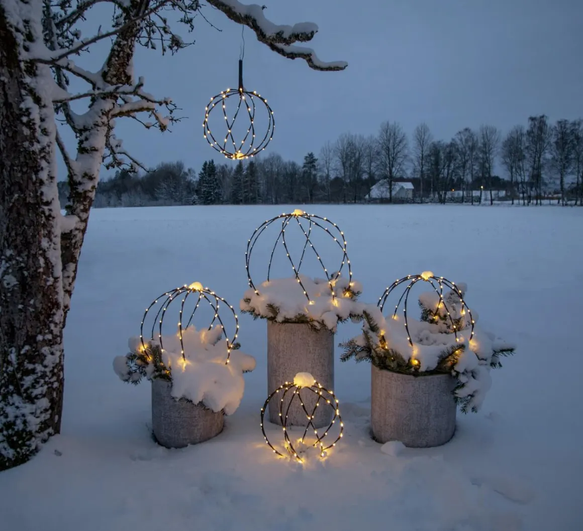 Sphere från Star Trading är ett dekorativt klot med 104 varmvita ljuspunkter, 50cm i diameter som ger ett härligt ljus till din trädgård. Produkten kan användas som både hängande och stående, markspettet är avtagbart och det finns en krok för upphäng, för att inte belasta kabeln rekommenderar vi att du använder en kedja eller rep att hänga klotet i. Batteribox för utomhusbruk. Klotet är hopvikbart vilket sparar utrymme när den inte används. Sphere finns i 3 storlekar här ser du den största.