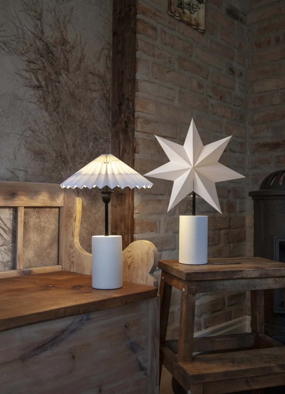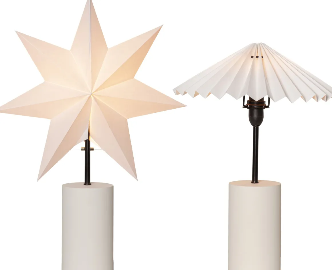 Stjärna och skärm, Stila är en komplett året runt lampa från Star Trading. Vit fot tillverkad i trä och svarta detaljer som ger den lilla extra touchen. Stjärnan är den perfekta stilrena dekorationen till jul och advent. Placera den i ett fönster eller på en skänk. Sprider härlig julstämning, när julen är över byter du till den läckra veckade skärmen och får på så sätt en perfekt dekoration hela året.