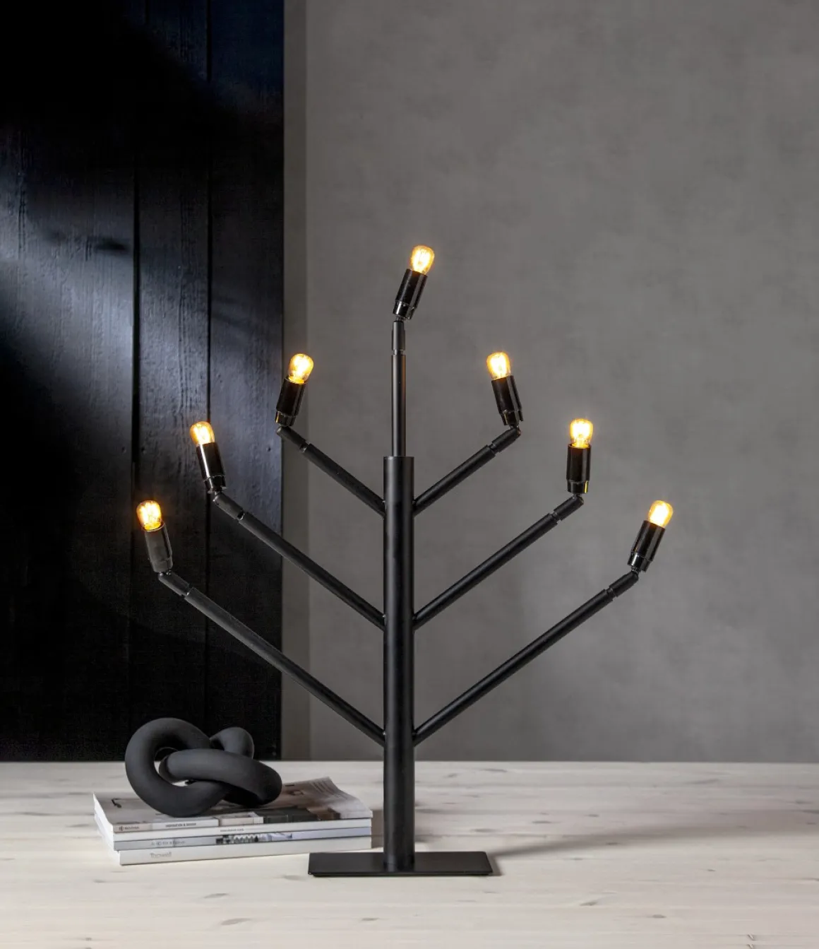Exklusiv, stilren och modern svart metalljusstake från Star Trading. Köp till valfri ljuskälla och ge din ljusstake din egna personliga touch. Vridbara lamphållare som kan riktas och ändra ljusstakens utseende. Skapar julkänsla i ditt hem från år till år.