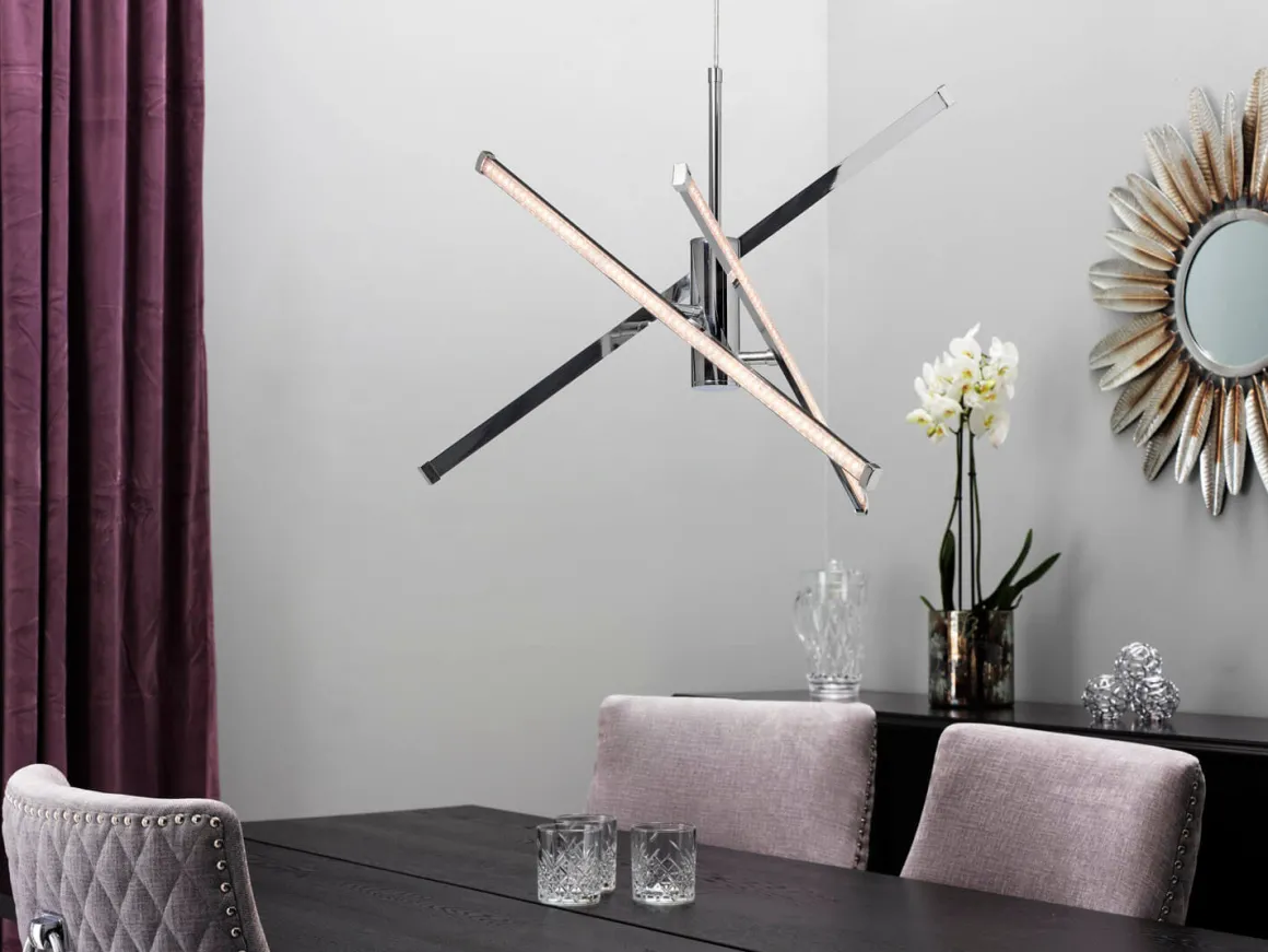 Kolla in denna läckra taklampan från Cottex! Strazza har 3 stycken glittriga, lysande ställbara armar omslutna av kromadmetall. Inte nog med att Strazza är vacker som en dag, utan kommer med inbyggd 3 stegs dimfunktion. Detta innebär att du med hjälp av din strömbrytare ställer in hur starkt du vill att den ska lysa. Vid start lyser lampan 100% men om du släcker och tänder lampan så dimras den automatiskt ner till 40%. Upprepa en gång till så lyser den med 10%, magiskt! Justerbar sladd med max h