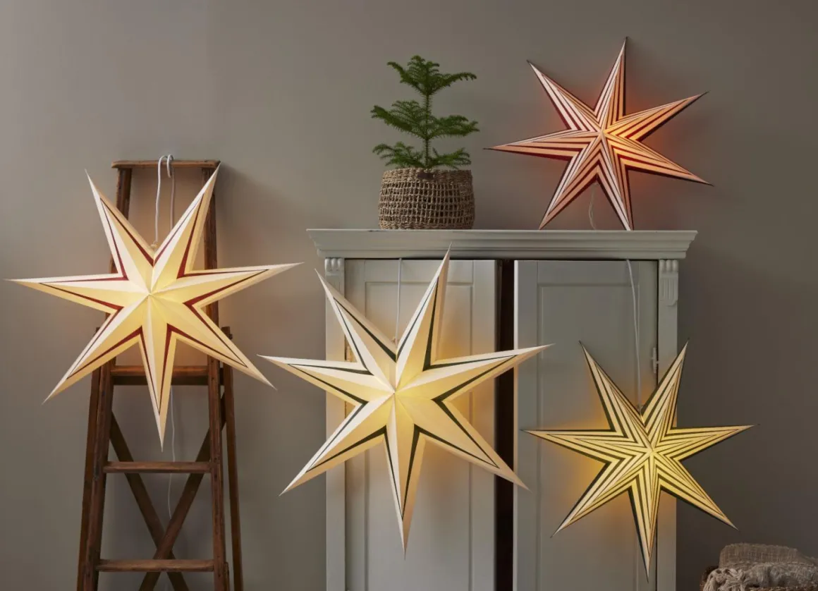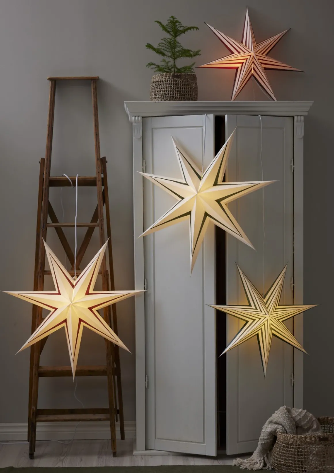 Lys upp julen med Adventsstjärna Randig från Star Trading! Denna vita stjärna med mörkgröna ränder i FSC®-märkt papper sprider härlig julstämning. Häng i fönster eller på vägg. Köp till sladdställ och ljuskälla för ett varmt sken. Perfekt för advent och jul!