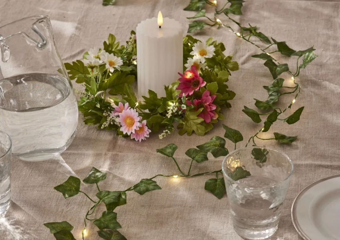Denna vackra krans med sommarblommor i vitt och rosa sprider ett mjukt och behagligt ljus med sina 15 varmvita dewdrop LED-lampor. Perfekt för att dekorera dörren, fönstret eller som en fin detalj på ett bord – varför inte använda den som en midsommarkrans? Den har en metallstomme på 20 cm i diameter och drivs av 2xCR2032 batterier (ingår ej).