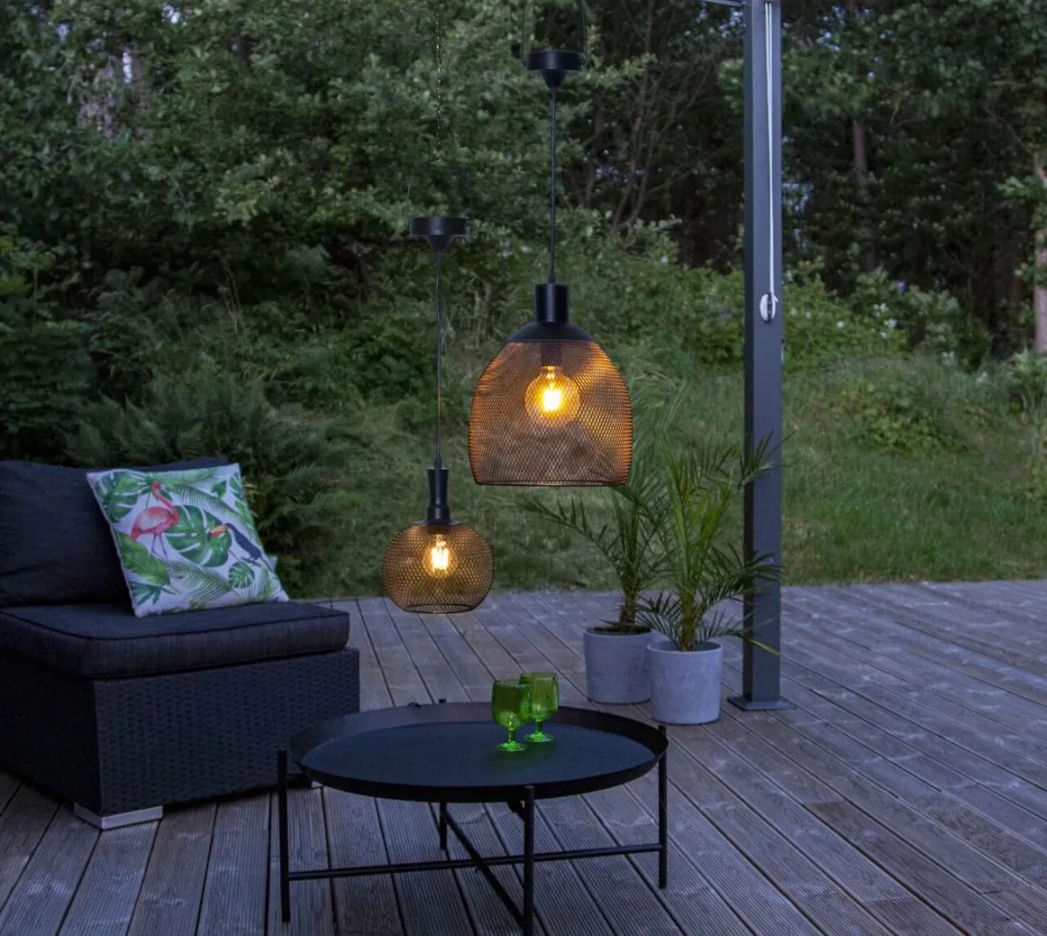 Härlig solcellsdriven lampa i svartlackad metall från Star Trading, perfekt att hänga över bordet utomhus, laddas av solen för att tändas upp när det mörknar.