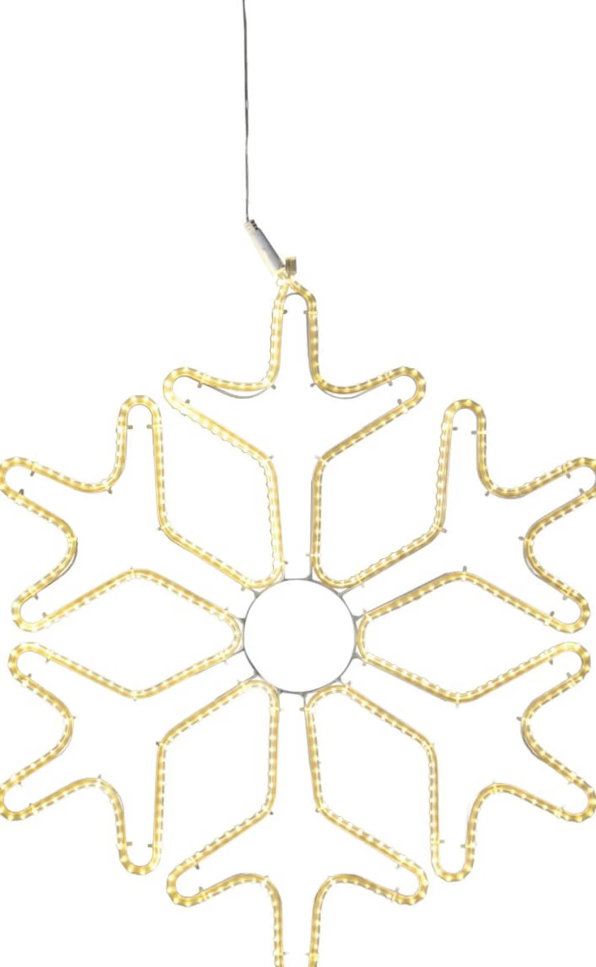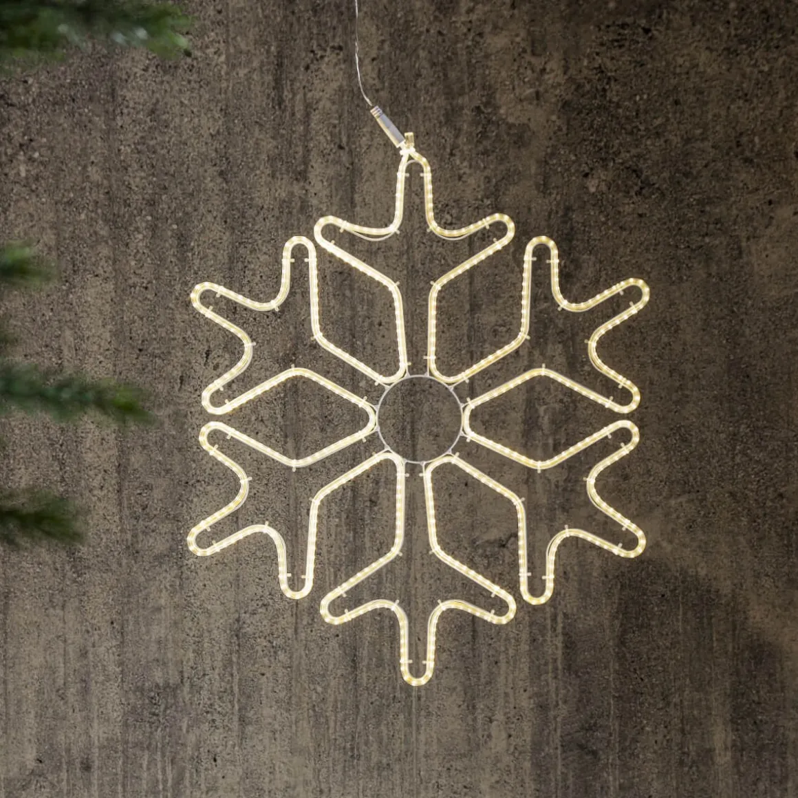 Vackert lysande siluett med formen av en snöflinga. Runt hela siluetten lyser det hela 480 små små varmvita led lampor. Perfekt att hänga på en dörr eller mot fasaden.
