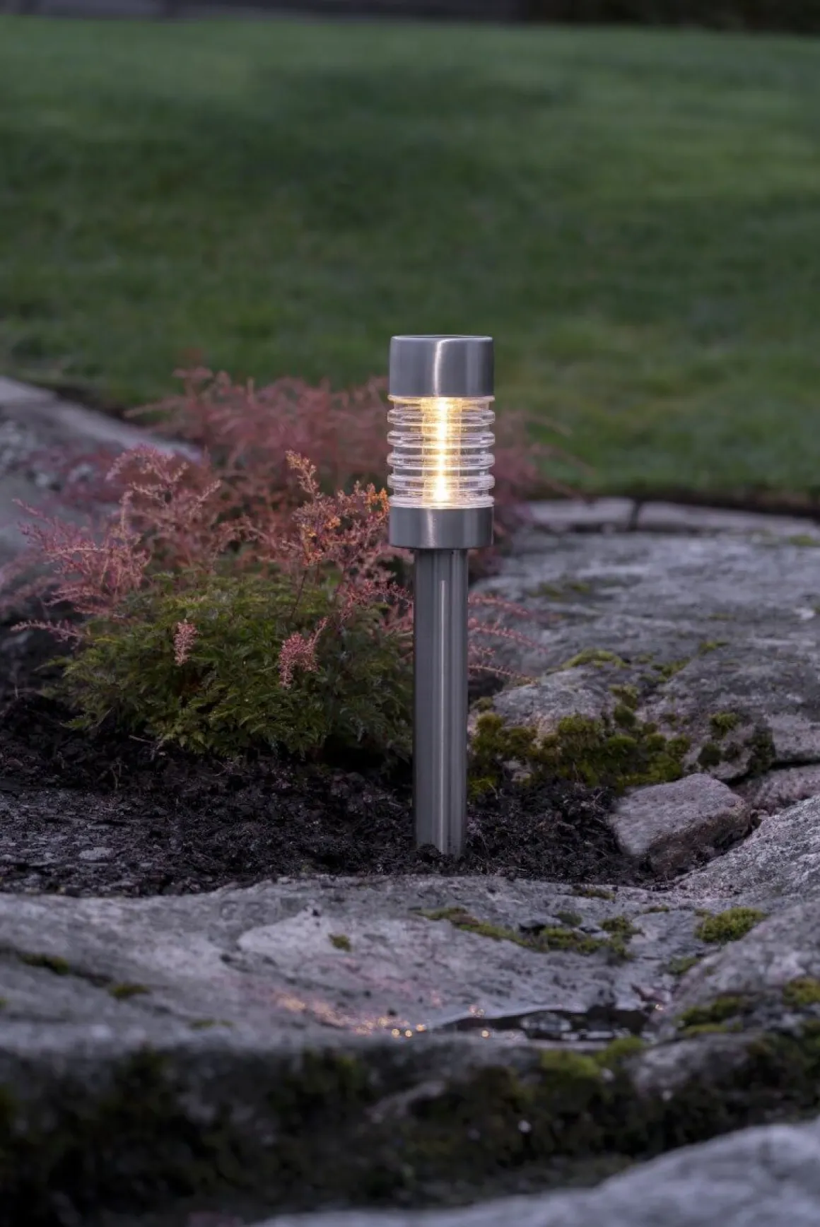 Härlig solcellspollare från Star Trading med kropp i borstat stål och ett räfflat glas som bryter ljuset på ett vackert sätt. Perfekt att belysa en rabatt eller en gångstig med under sommarkvällarna.
