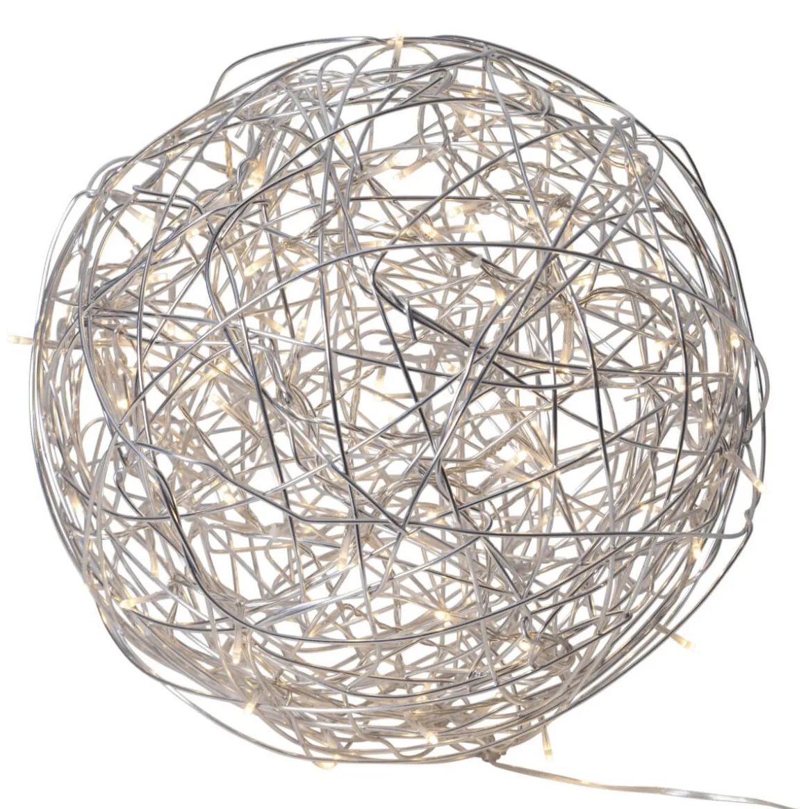 Läcker dekorativ silverfärgad version av Trasselbollen för både inom- och utomhusbruk. Inuti dekorationen finns en LED-ljusslinga med 100 stycken ljuspunkter som avger ett varmvitt sken. Designad av Charlotte Falck.