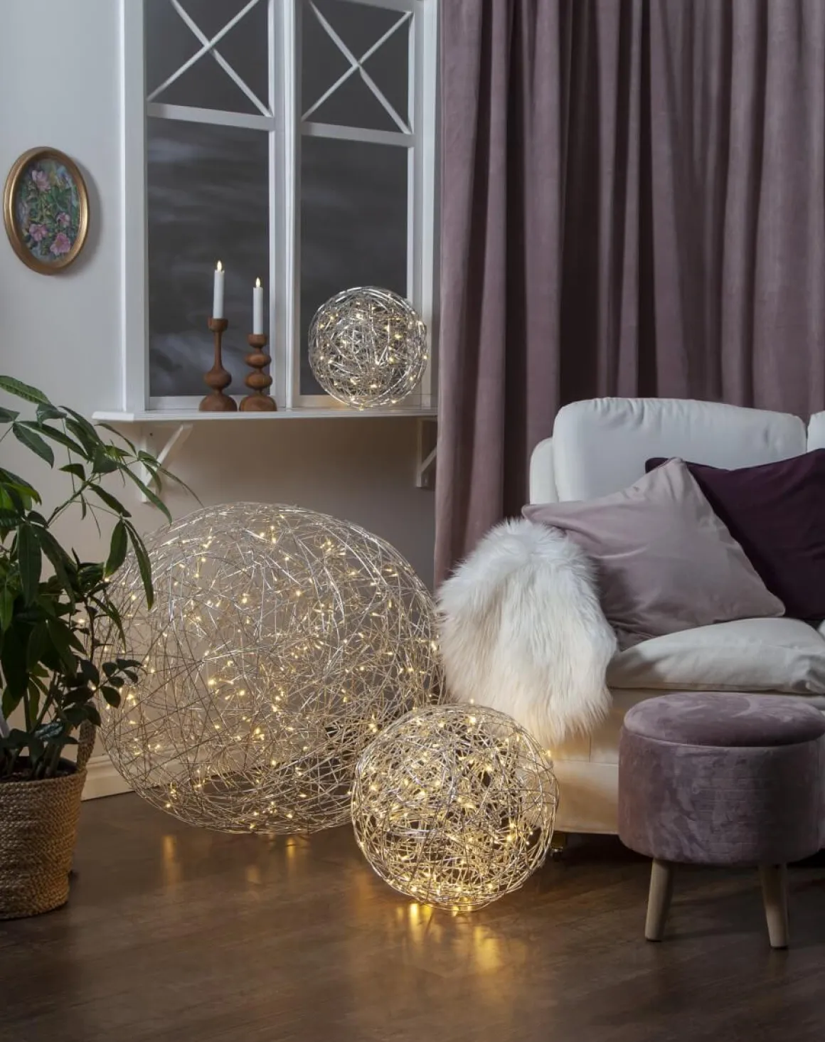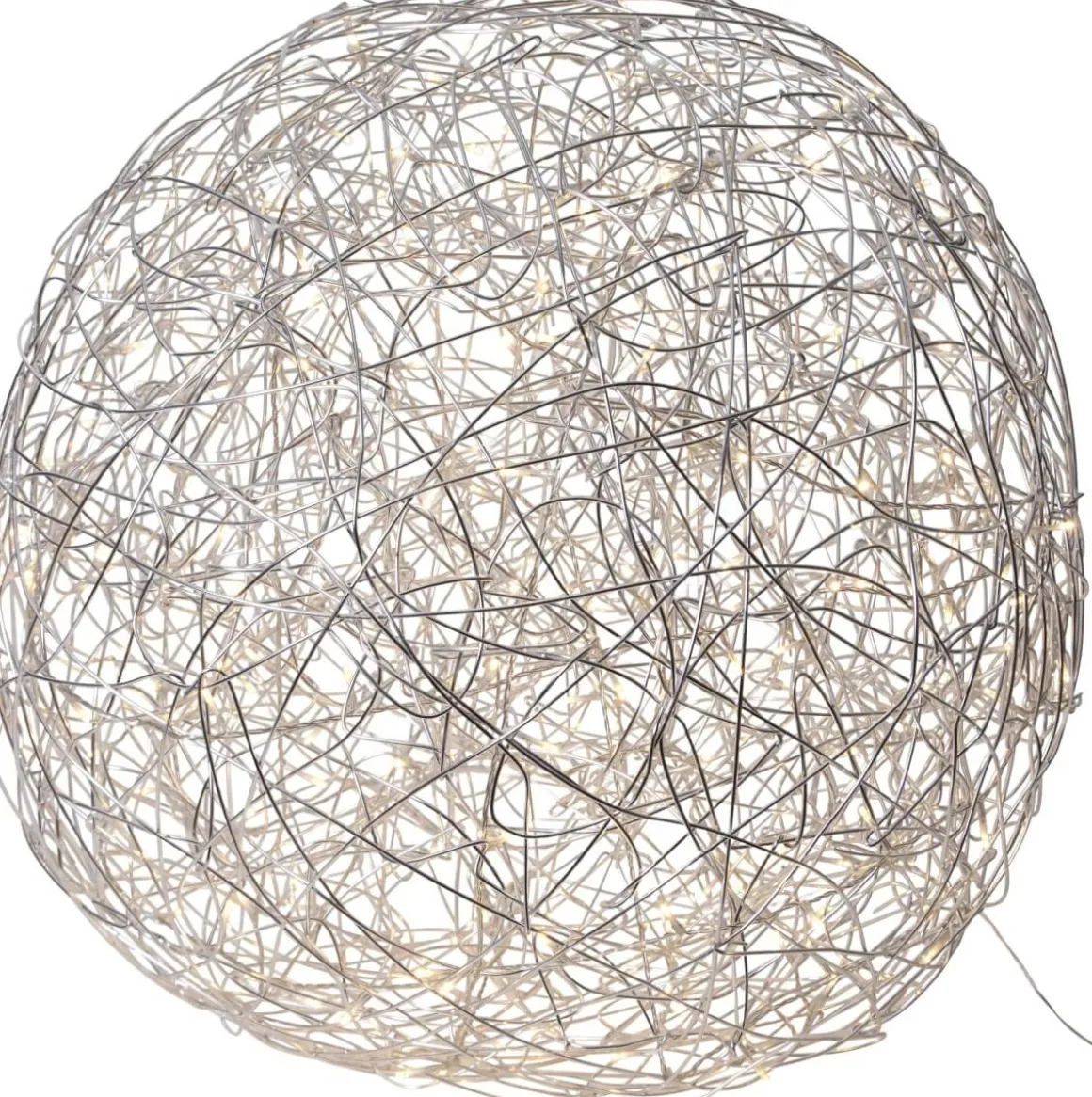 Läcker dekorativ silverfärgad version av Trasselbollen för både inom- och utomhusbruk. Inuti dekorationen finns en LED-ljusslinga med 200 stycken ljuspunkter som avger ett varmvitt sken. Designad av Charlotte Falck.