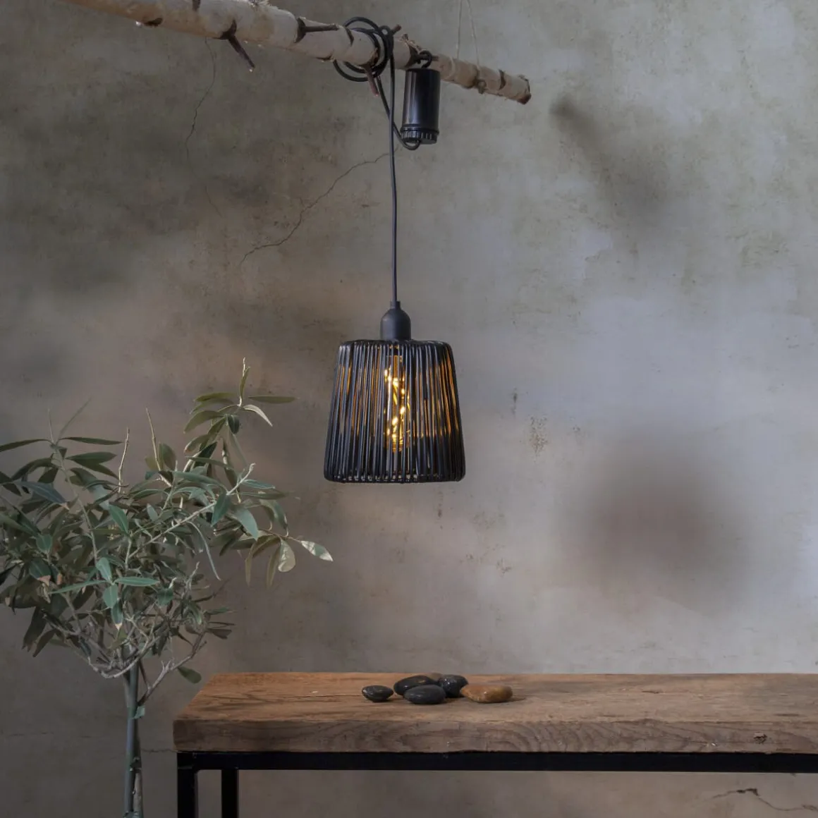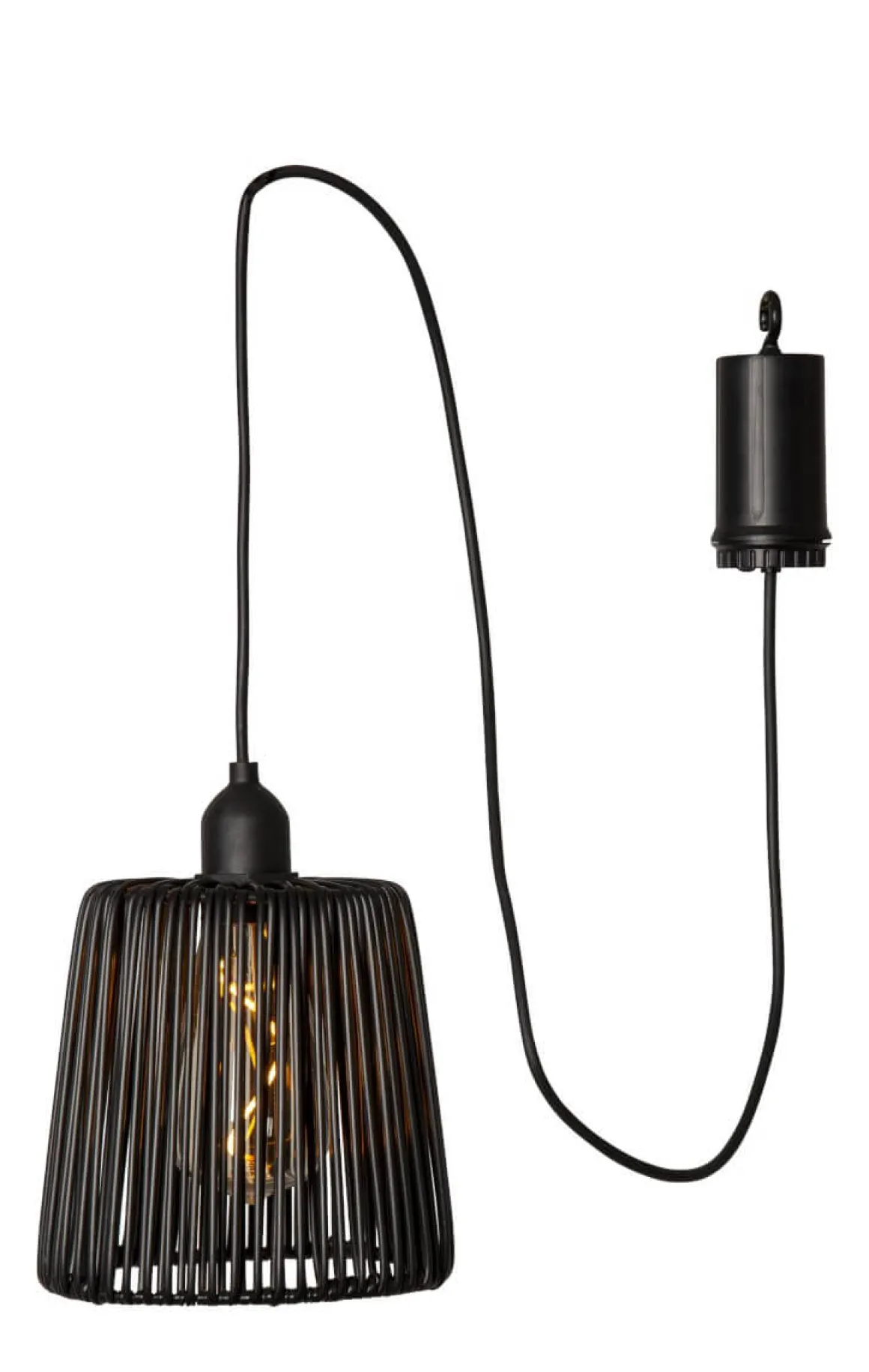 Elegant komplett lampskärm i svart konstrotting med batteridrivet upphäng för både inomhus och utomhus användning. Drivs med vanliga AA batterier och har självklart en timerfunktion så att du lätt själv kan ställa in när du vill att den ska lysa. Batterier köpes separat.