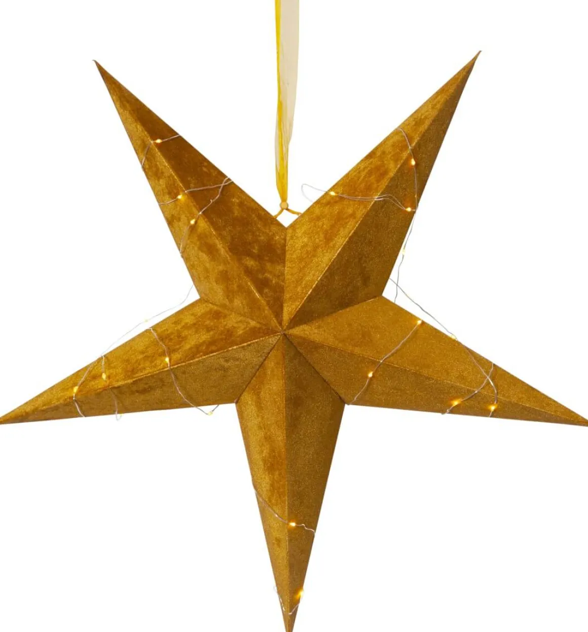 Så läcker serie med sammetsstjärnor från Star Trading, Gemensamt för dem alla är att de levereras med den snygga Dewdrop ljusslingan som du sedan virar runt stjärnan, drivs gör den med batterier, självklart med en inbyggd timer så du enkelt kan bestämma när du vill att den ska lysa. här ser du velvet i guldig sammet.