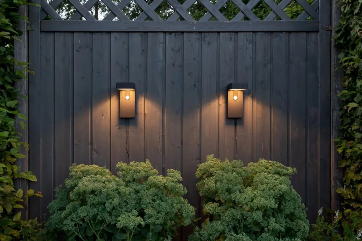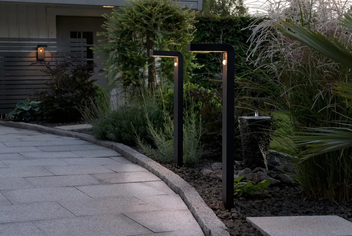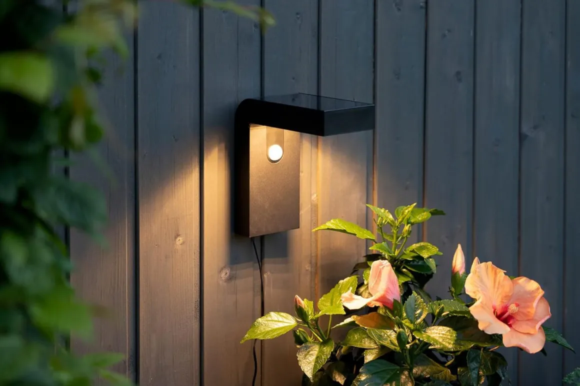 Solcellsdriven modern väggbelysning som under natten lyser upp med 300 Lumen i 25 sekunder när du passerar den och går sedan ner till 30 Lumen konstant ljus.
