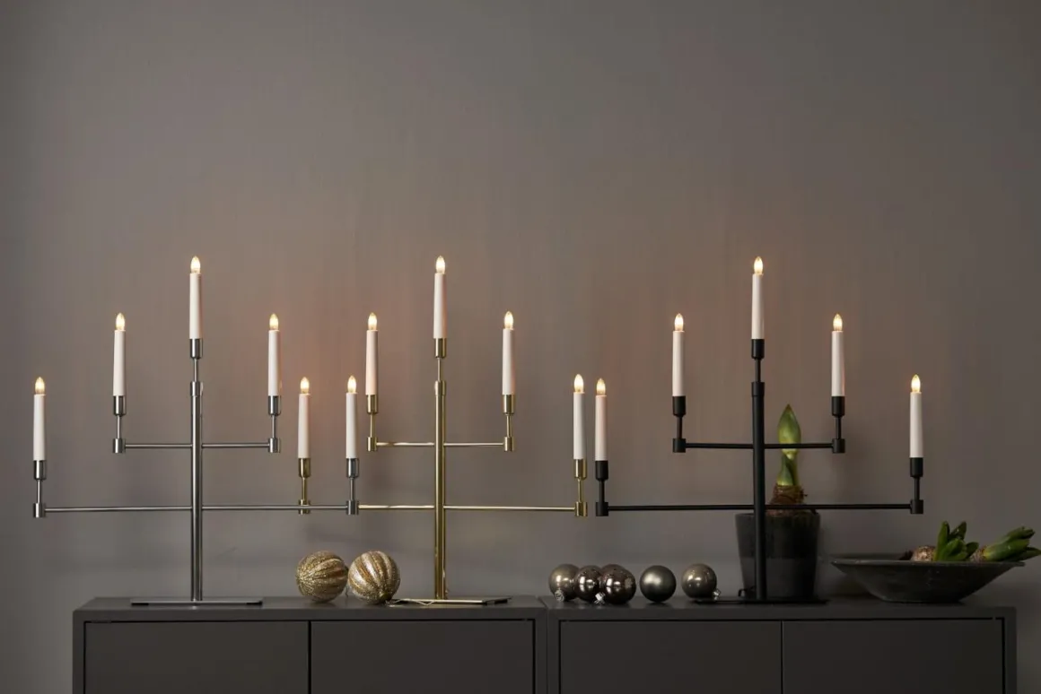 Modern och stilren adventsljusstake i krom från Star Trading, Vide är tillverkad i metall och har 5 stycken ljuskällor. När enkelhet och stilrent är ledordet så är Vide ett perfekt val.
