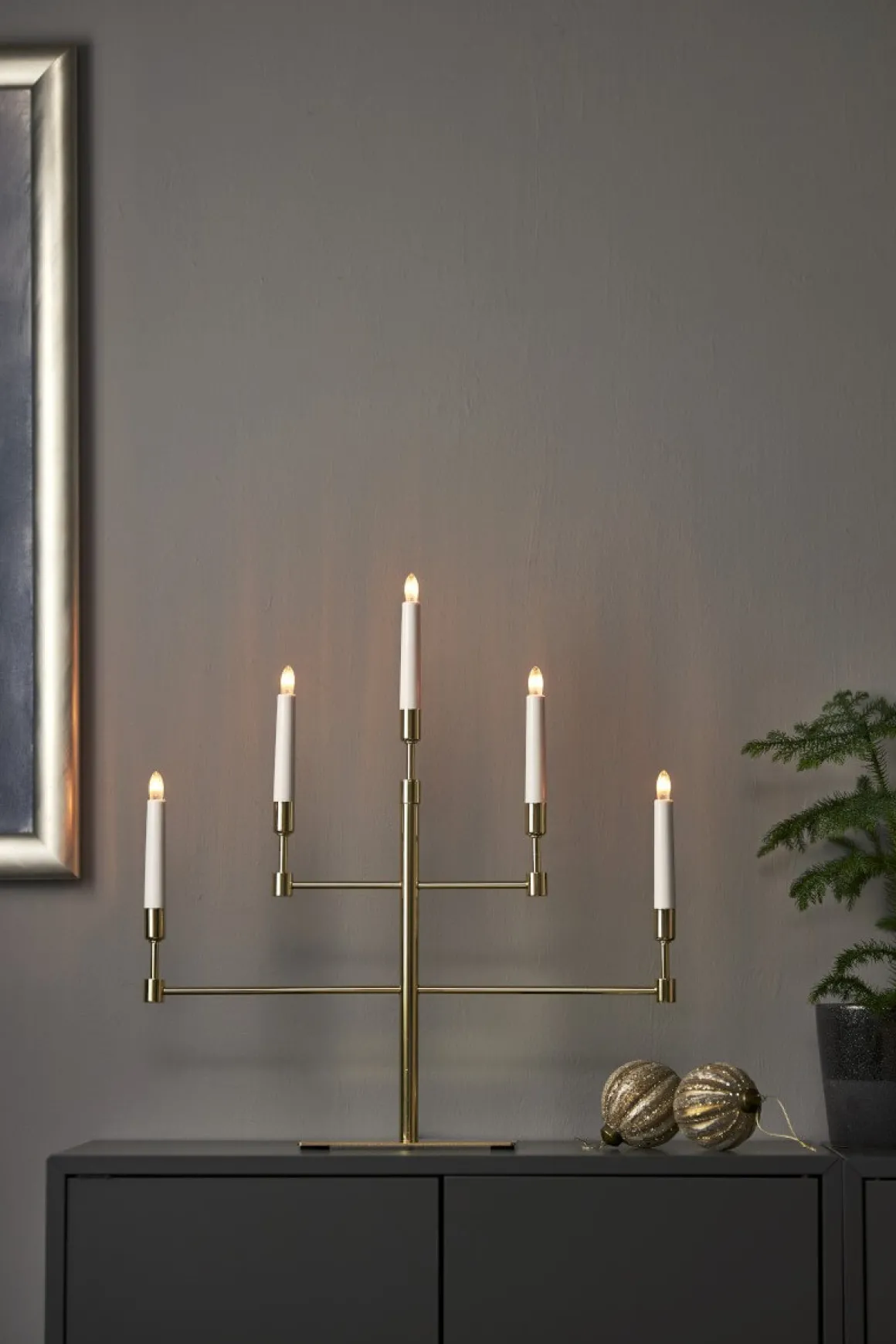 Modern och stilren adventsljusstake i mässingsfärg från Star Trading, Vide är tillverkad i metall och har 5 stycken ljuskällor. När enkelhet och stilrent är ledordet så är Vide ett perfekt val.