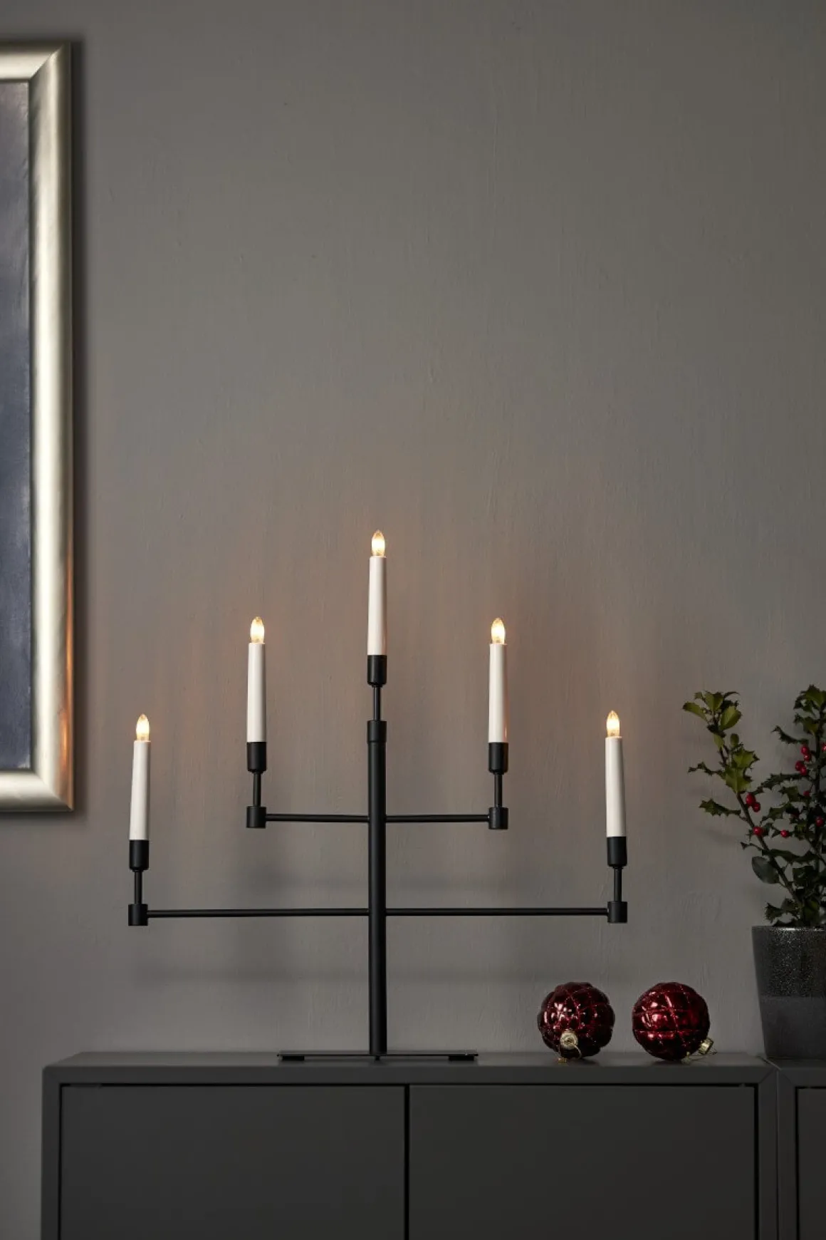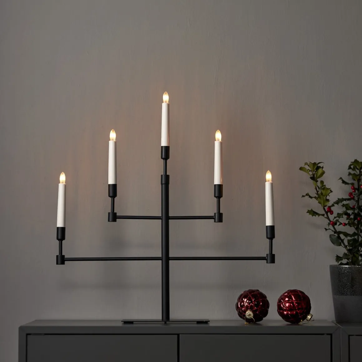 Modern och stilren adventsljusstake i svart från Star Trading, Vide är tillverkad i metall och har 5 stycken ljuskällor. När enkelhet och stilrent är ledordet så är Vide ett perfekt val.
