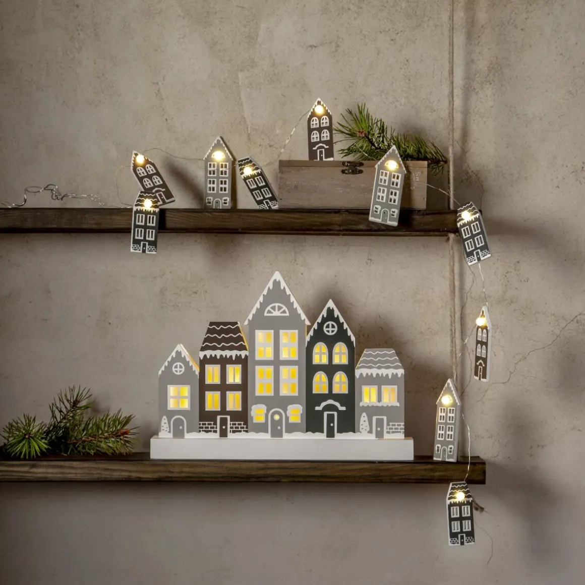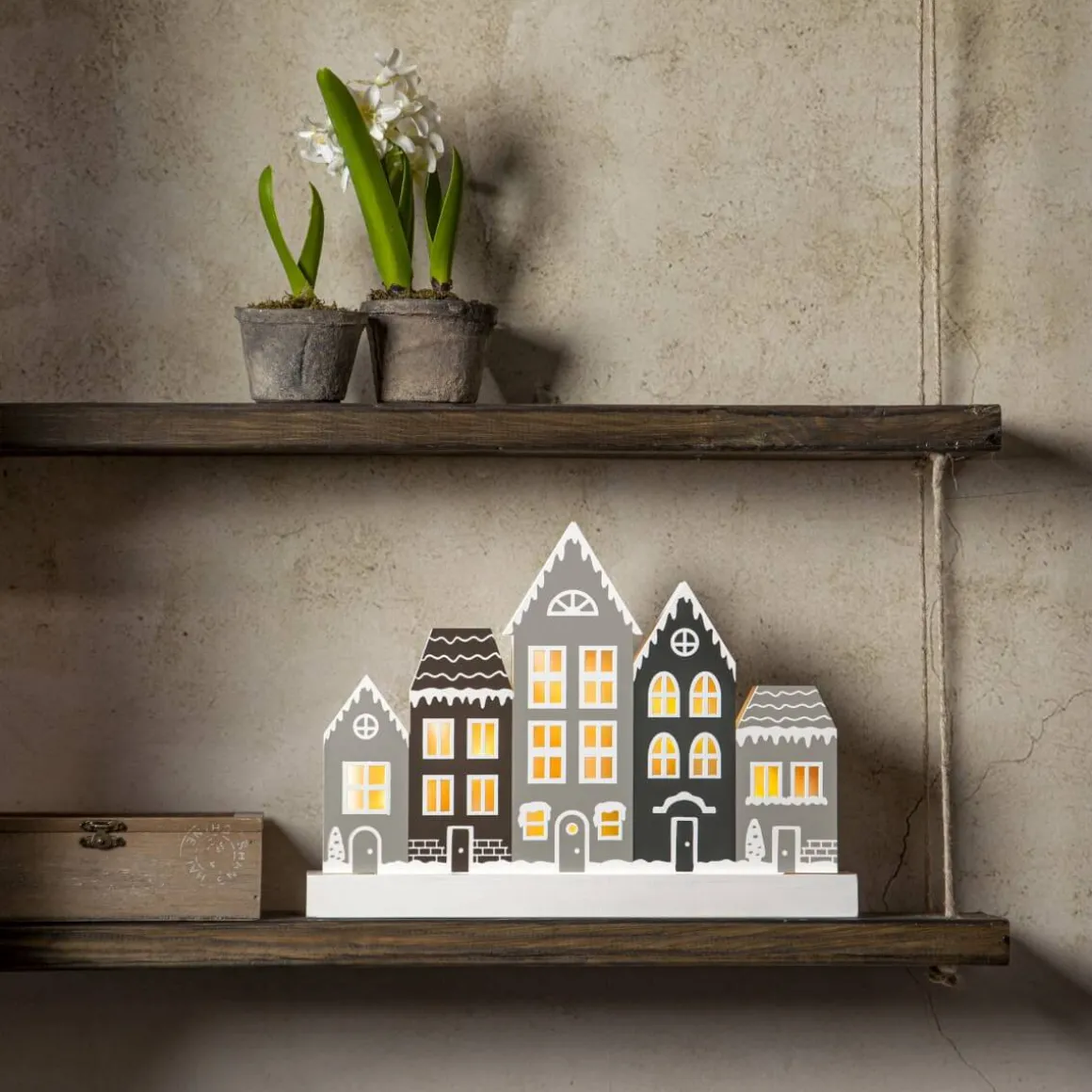 Villa är en detaljrik laserskuren silluett från Star Trading med fem hus på rad. Det lyser fint i fönstren när Villa är påslagen. Dekorera till advent och jul och placera hus-dekorationen på en hylla eller på en byrå för att få den perfekta julkänslan.