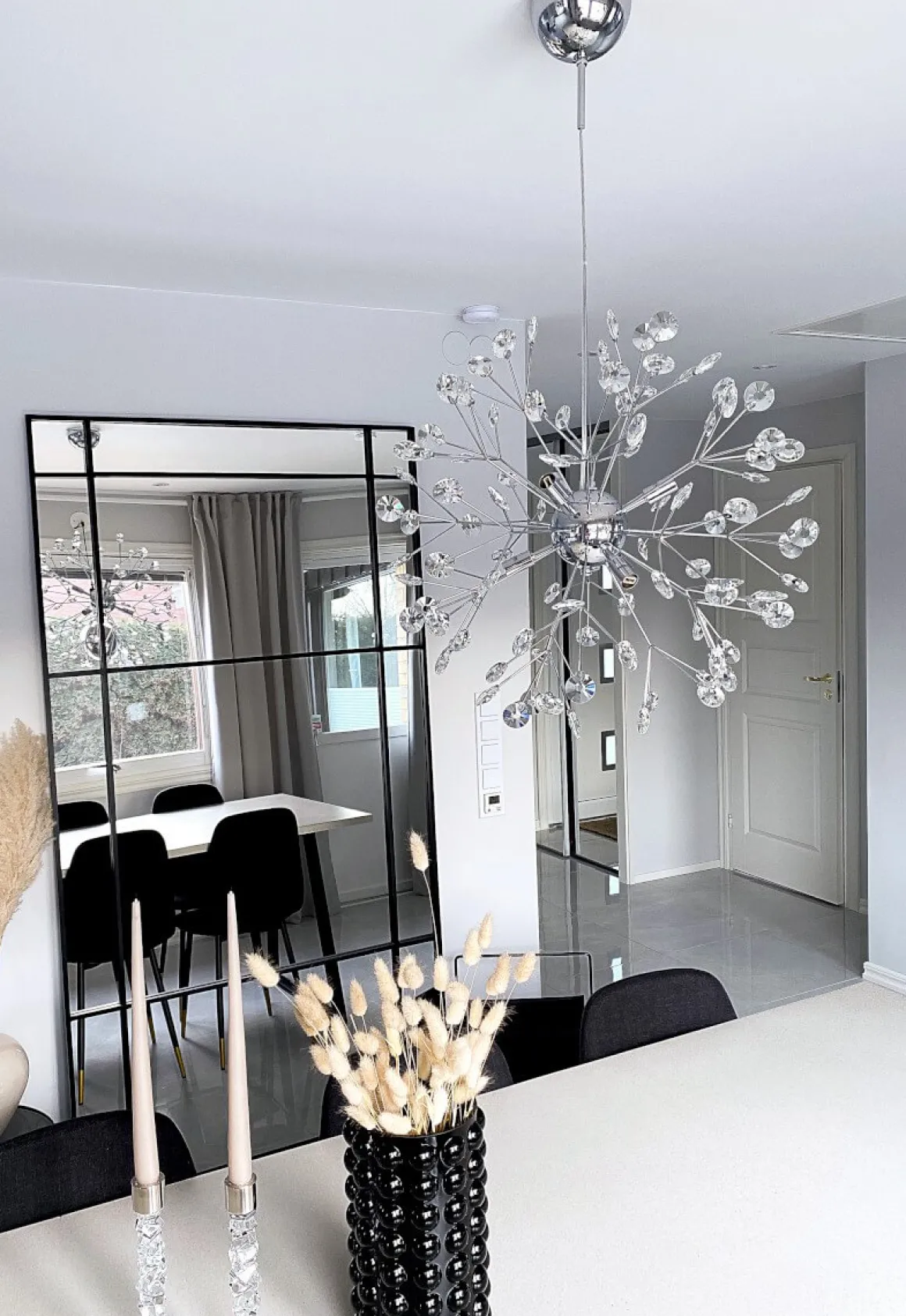 Åh vackra viva taklampa med sina grenliknande armar med en gnistrande prisma i varje ände ger ett pampigt och lyxigt intryck. Med 6 stycken G9 ljuskällor lyser hon upp såväl i hallen som i vardagsrummet. Här ser du Viva i krom.