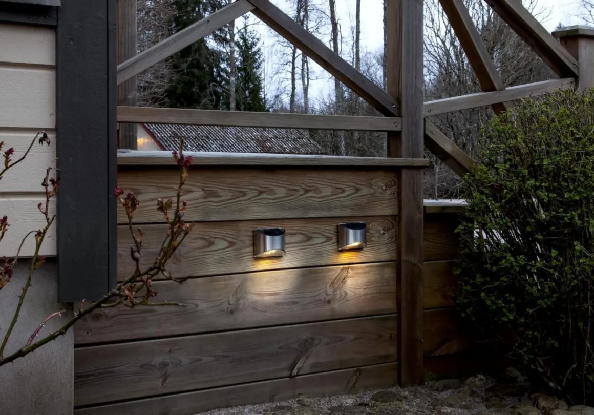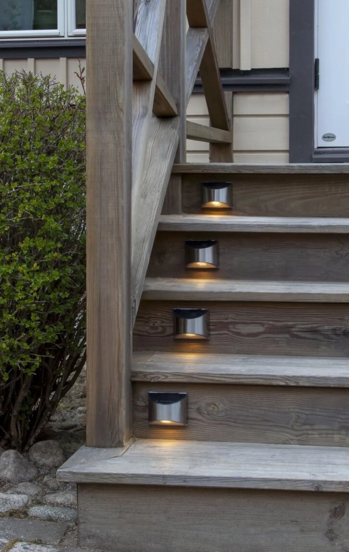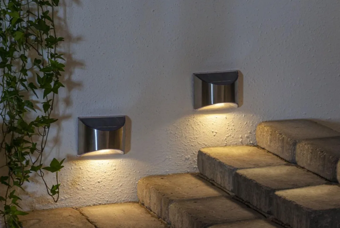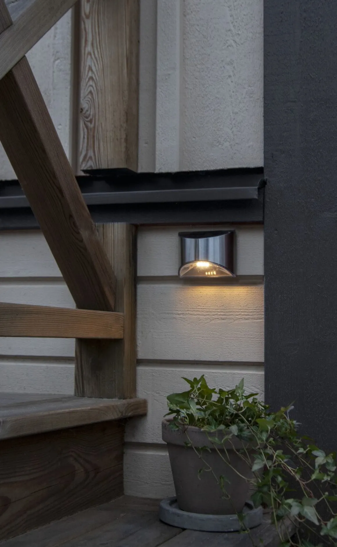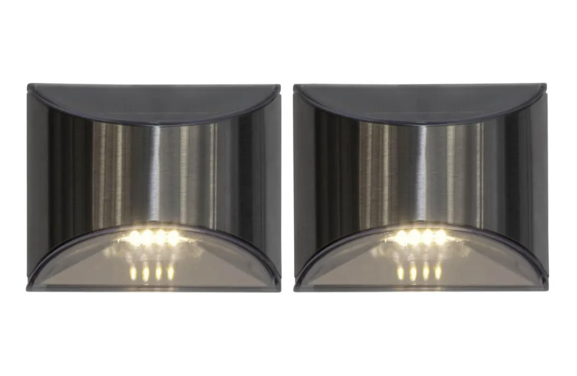 Wally från Star Trading i ny modern design. 2 Pack med söta små downlights i borstat stål som laddar sig själva med hjälp av solens strålar under dagen för att lysa upp din fasad eller mur under kvällens mörka timmar.