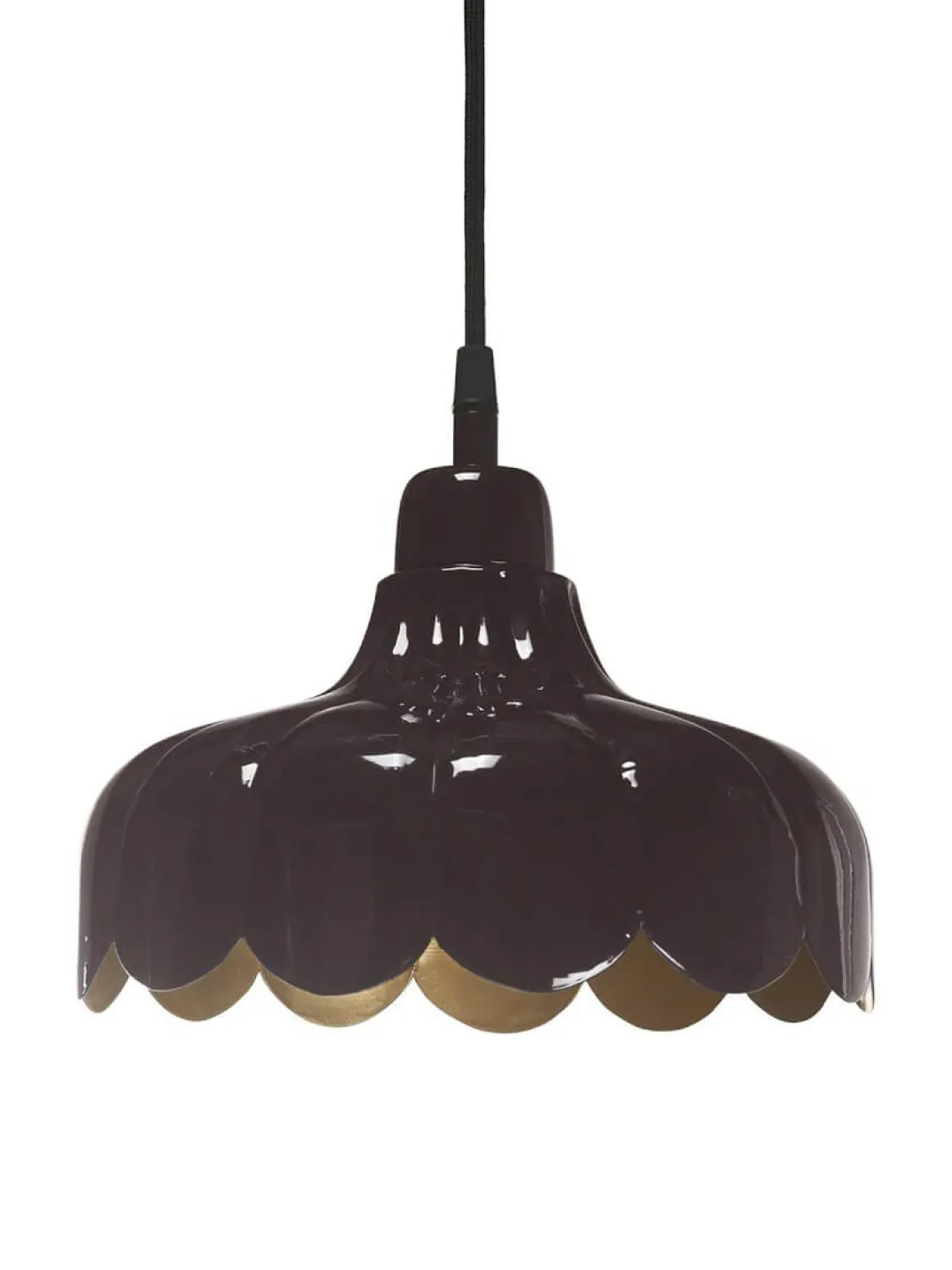 PR-homes nya serie Wells ger en fräsch romantisk känsla i ditt hem. De har tydligt inspirerats av en blomma och skapat denna serie med taklampa, fönsterlampa och bordslampa i 4 färger, rosa, grön, vit, beige, brun och svart. Alla har en guldfärgad insida som sprider ett varmt härligt sken. Varje skärm är handgjord. Wells kommer pryda ditt hem med sina feminina former och läckra färger. Här ser du tak/fönsterlampan i Brun.