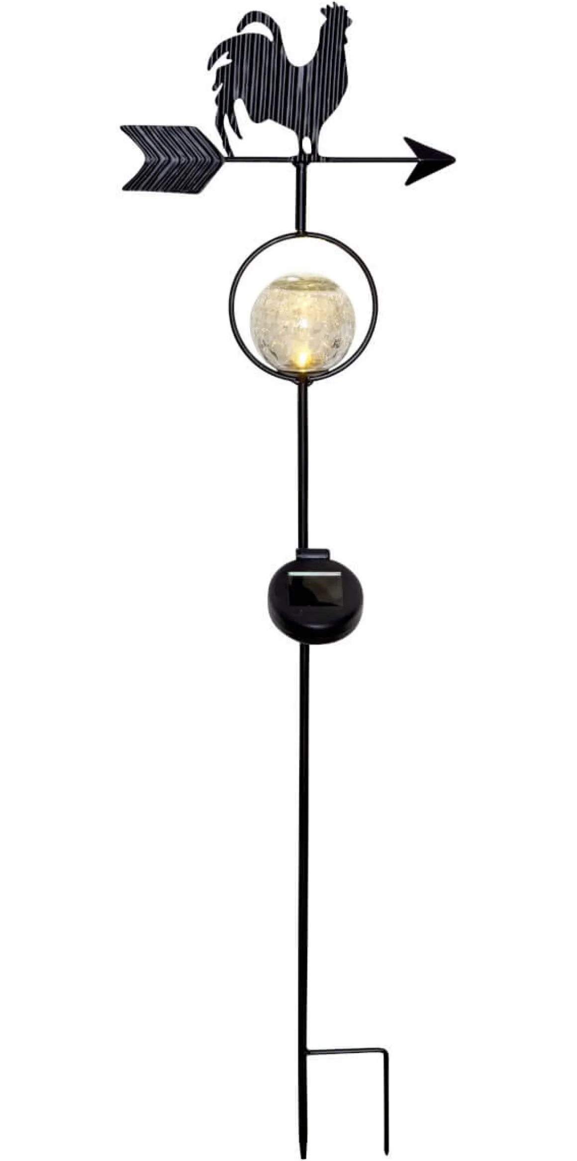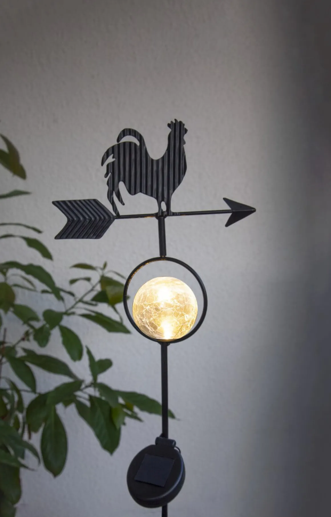 Solcellsdekoration i form av vindflöjel med tupp och vindriktningspilar från Star Trading. Ett varmvitt sken lyser under natten genom den krackelerade glaskulan.