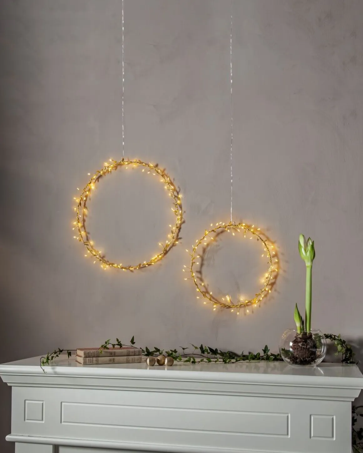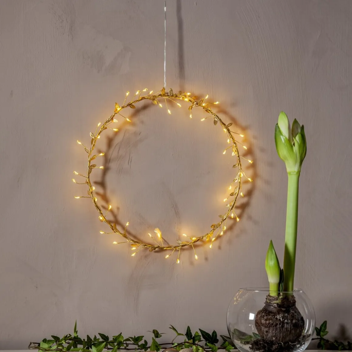 Stämningsfull batteridriven guldkrans på 28 cm från Star Trading, små söta guldlöv i polyester pryder kransen samt 60 små led ljuspunkter lyser fint i kransen. Dekorerar till jul och advent eller varför inte så fort den mörka årstiden börjar. Häng dekorationen i ett fönster, mot en dörr eller vägg. Självklart har Winn även timerfunktion så att du lätt kan ställa in när du vill att den ska lysa. Batterier köpes separat. Winn finns i 2 storlekar, här ser du den lilla på 28 centimeter.