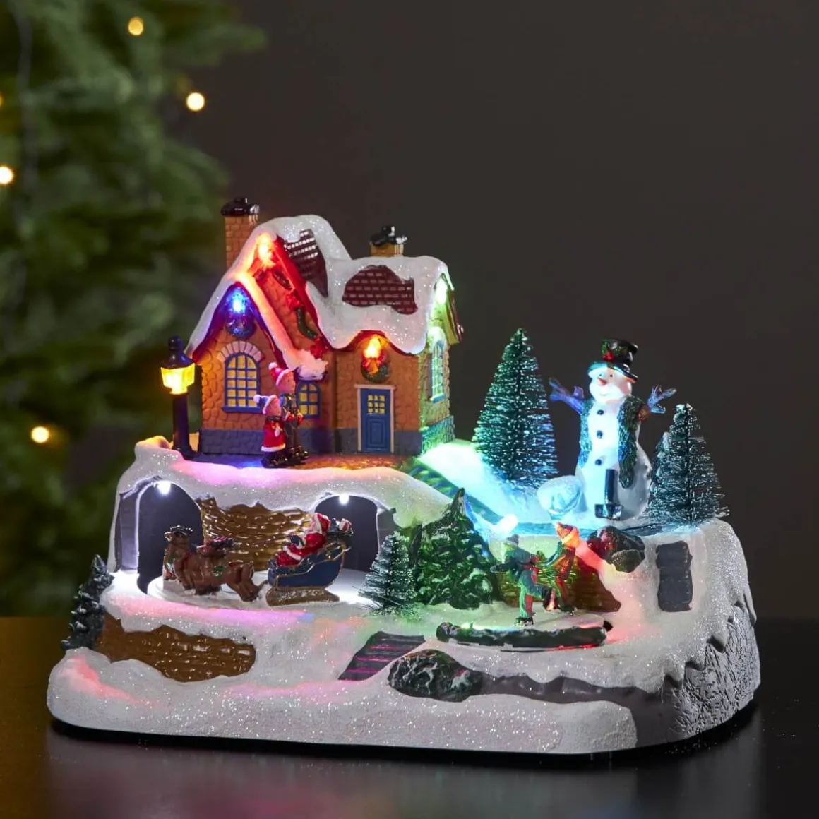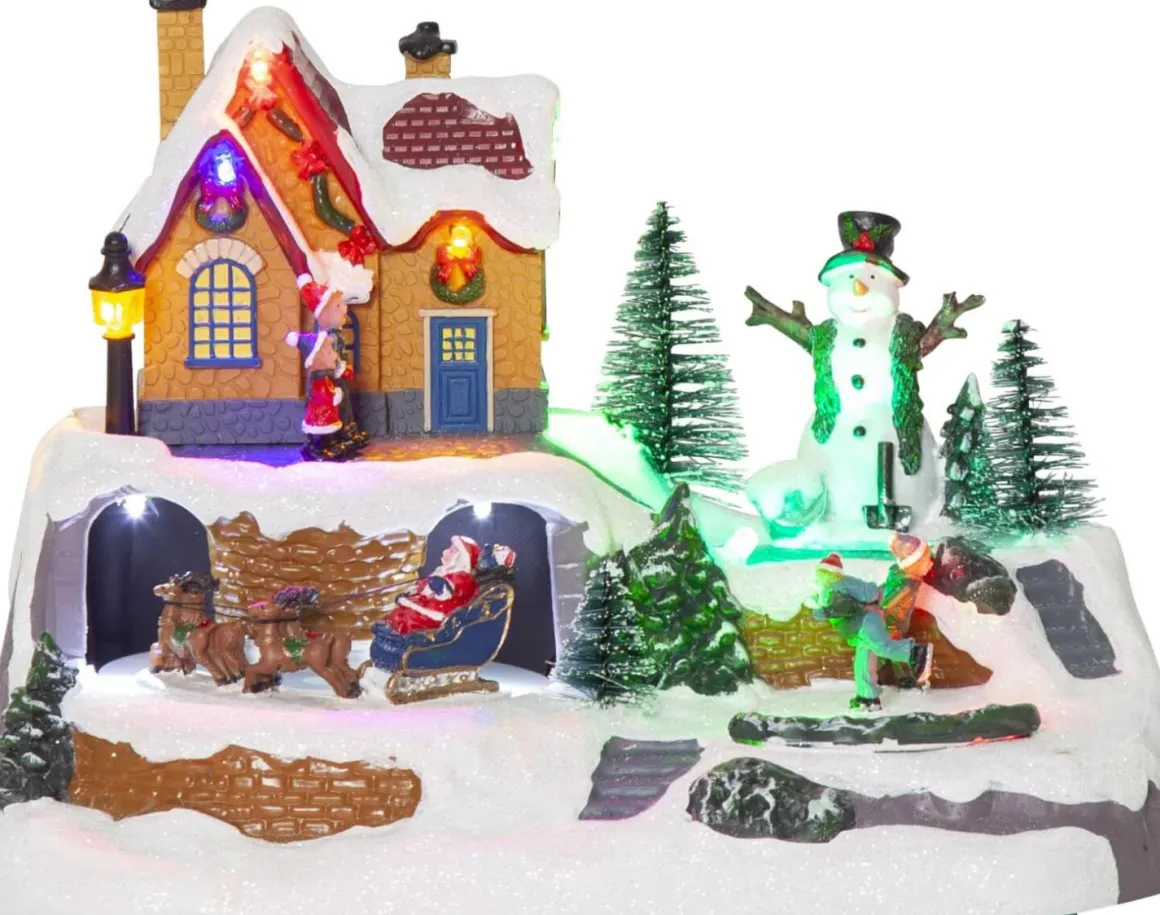 En härlig juldekoration med snögubben som ser ut över de skridsko åkande barnen och tomten med sin släde och renar. Huset har fina lyktor som lyser i olika färger. Alltihop tillsammans ger en fantastisk julkänsla. Staden har en roterande skridskobana, tomte med släde och renar som roterar och om man vill spelar byn 8 härliga julsånger. Dekorera med till advent och jul, passar både barnrummet och på en byrå i hallen.