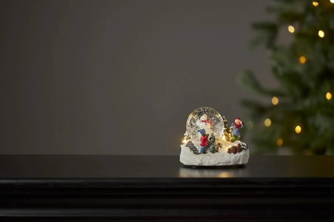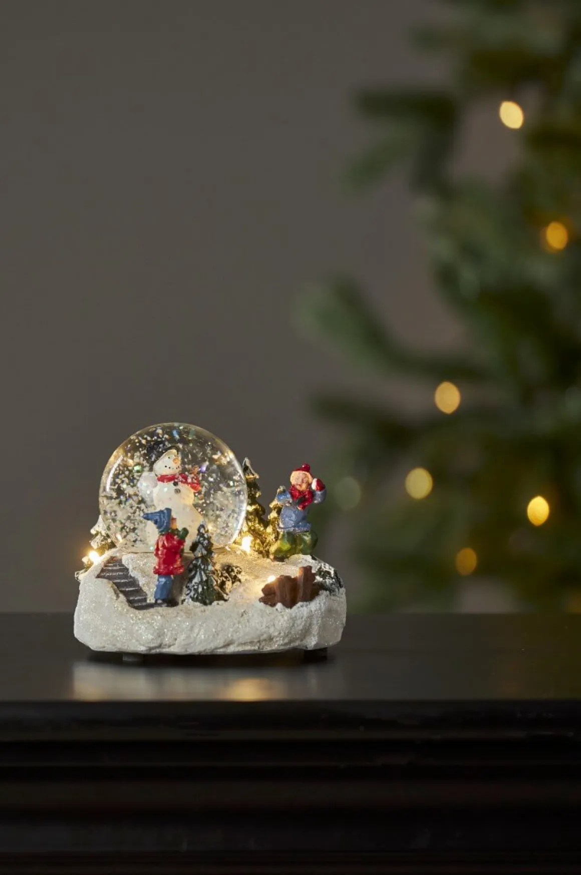 Vacker Snöglobs dekoration av glas från Star Trading. I globen hittar du en liten snögubbe och utanför leker barnen i snön. Skaka globen och snön faller vackert. Små varmvita led lampor lyser upp dekorationen. Drivs med batterier så det är lätt att finna plats till denna lilla sötnöten. Placera i en hylla eller på en bänk för att få en härlig julstämning.