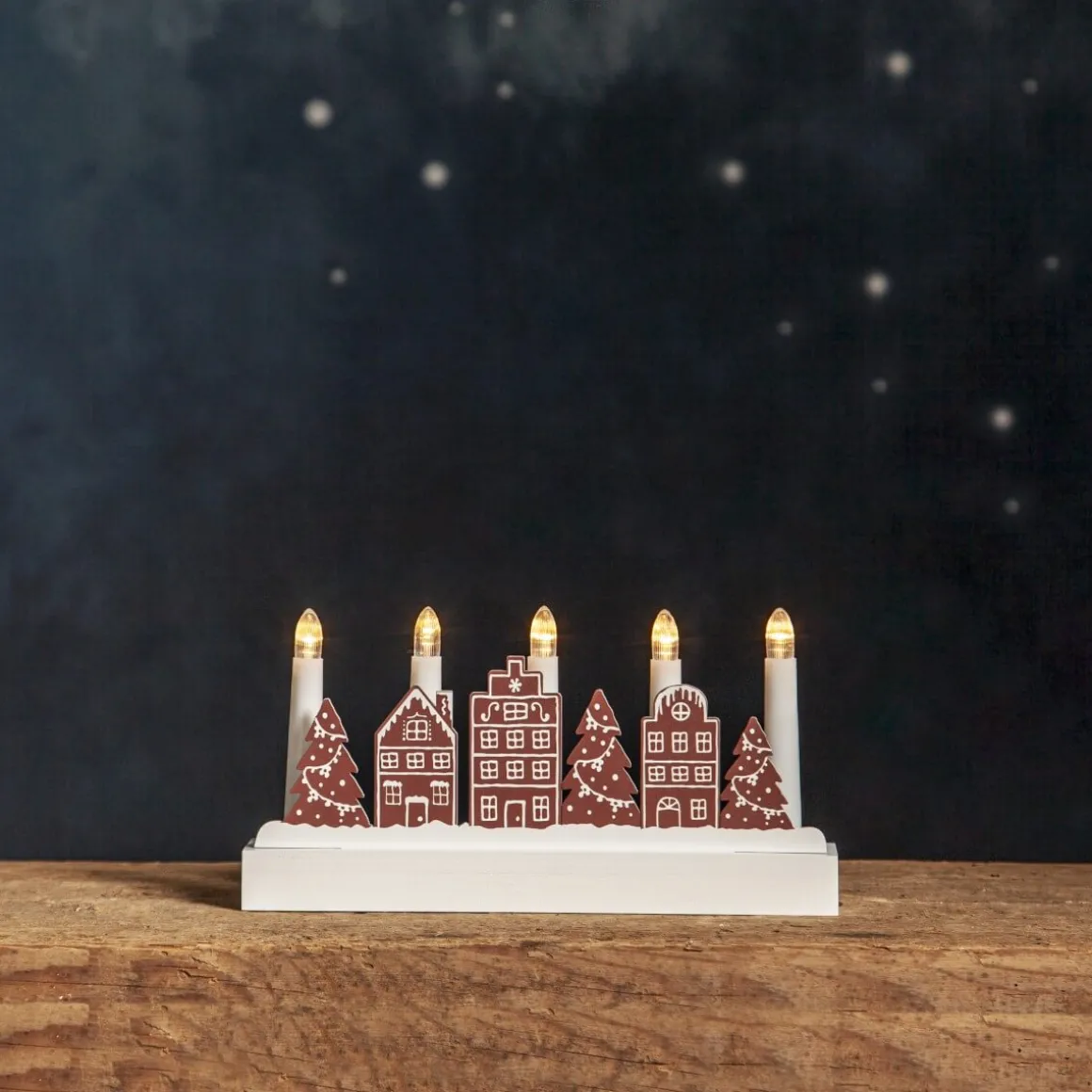 Yuletide är en liten batteridriven adventsljusstake från Star Trading med laserskuret motiv framför ljuspiporna. Pepparkakshus och granar. När underverket är påslagen lyser det fint i de fem ljusen.Perfekt dekoration till advent och jul, placera ljusstaken i ett fönster eller på en hylla för att få den perfekta julkänslan.