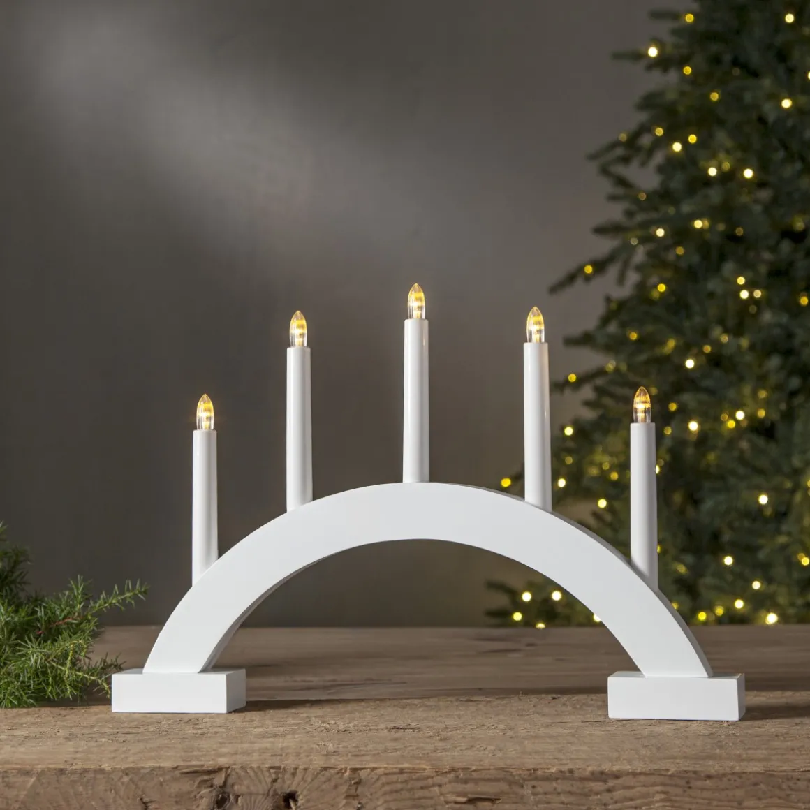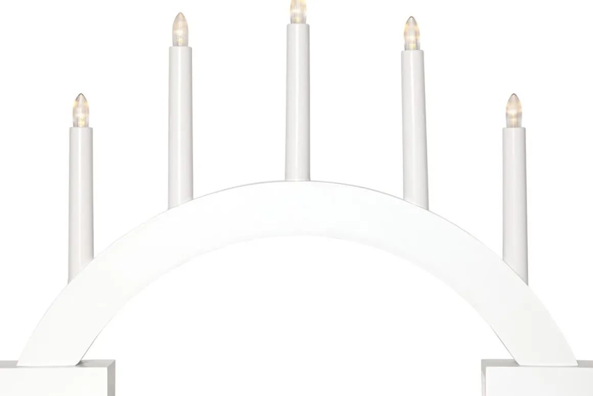 Abbe är en liten söt batteridriven vit bågformad träljusstake från Star Trading som gör sig alldeles utmärkt i det lilla fönstret såväl som på diskbänken, ger en mysig stämning i ditt hem med sina 5 varmvita ljus.