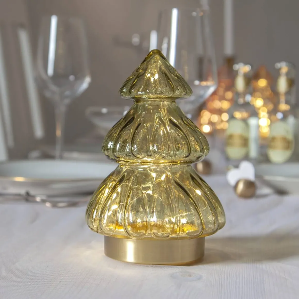 Så vacker bordsdekoration i form av en gran i transparent svagt grönfärgat glas. Guldfärgad bas som diskret gömmer batteriboxen. Abete drivs av 3 st AAA batterier och har självklart en inbyggd timerfunktion så att du lätt kan ställa in när du vill att den ska lysa. Perfekt som dekoration på det dukade julbordet. Batterier köpes separat.
