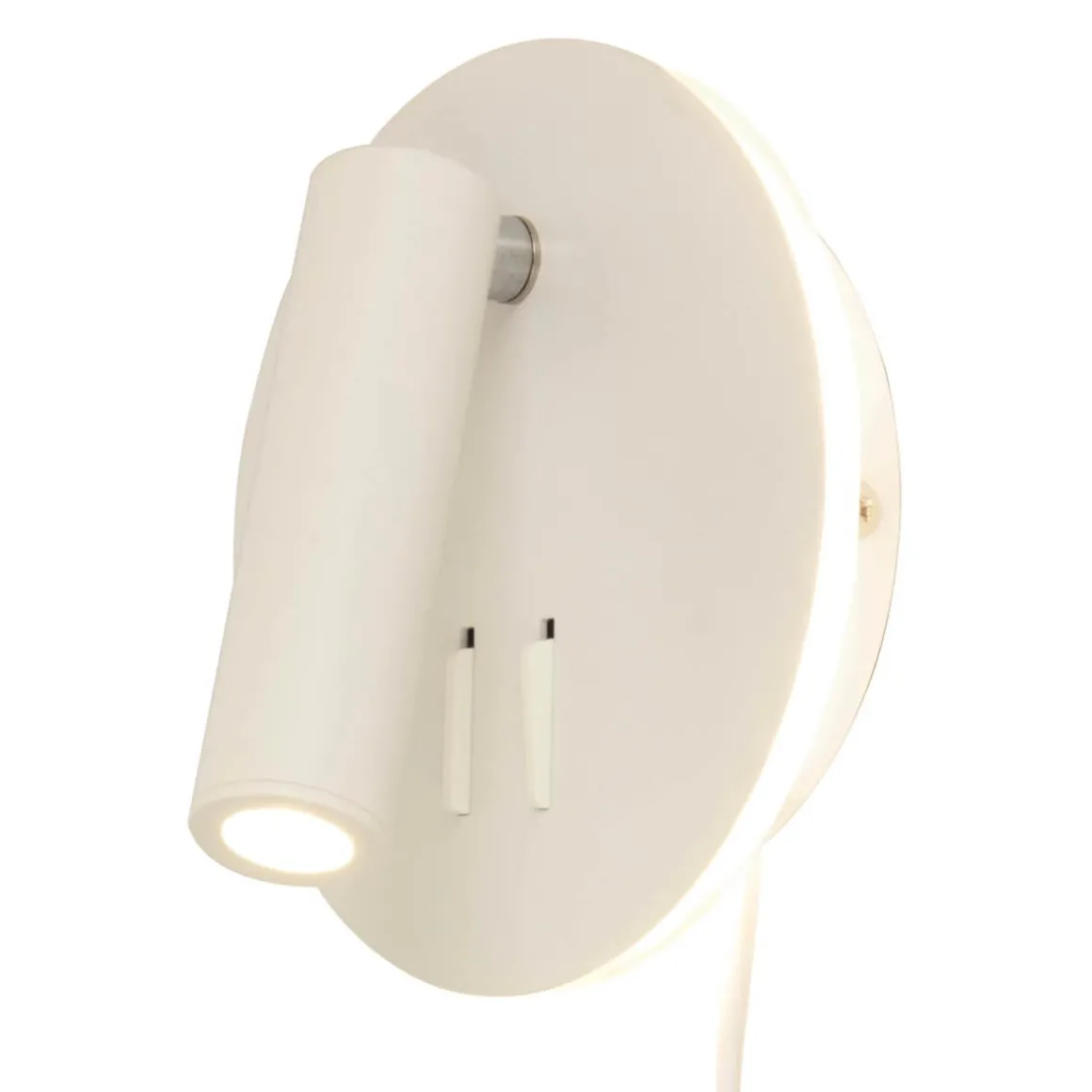 Kolla in tuffa ACE, liten smäcker vit vägglampa från Aneta med lysande platta som ger ett indirekt ljus mot väggen, kombinerat med en riktigt bra spotlight på 3W, 2 nätta strömbrytare är monterade under den riktbara spoten.