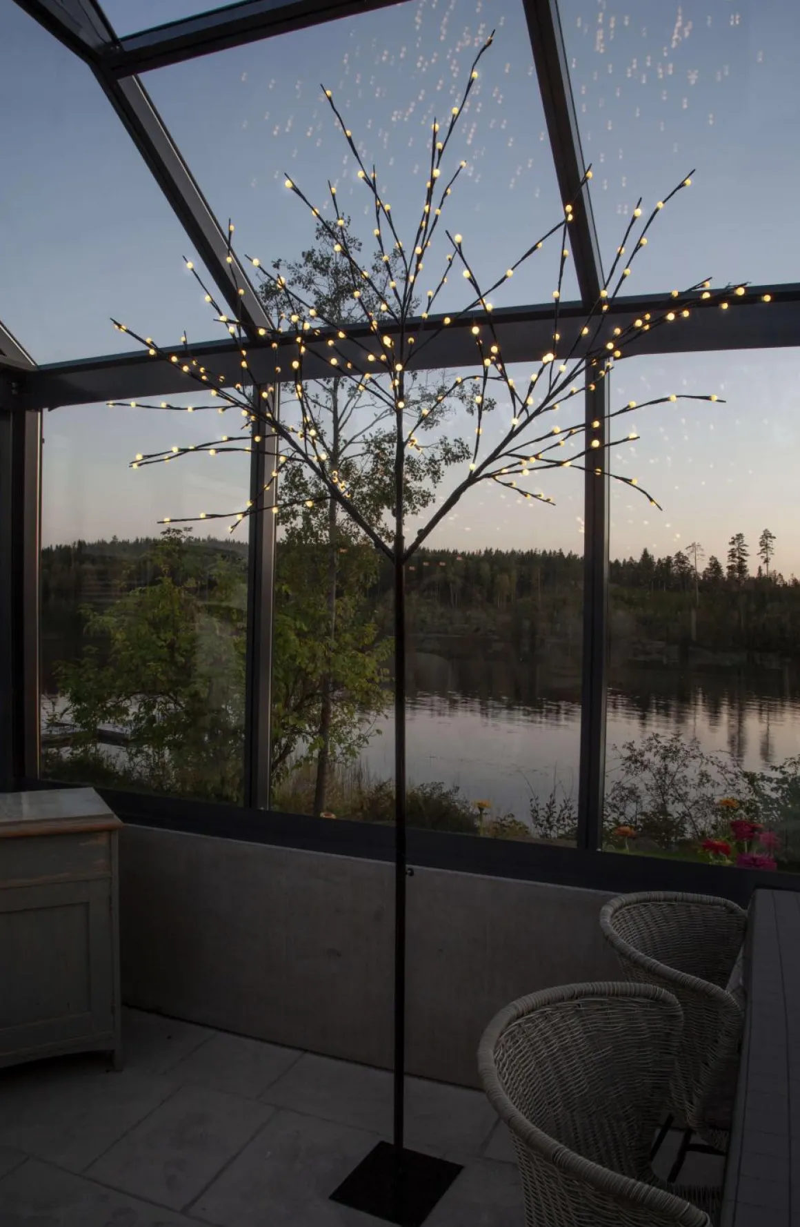 Skapa en magisk atmosfär i din utomhusmiljö med detta imponerande 250 cm höga dekorationsträd. Trädet har en svart stamm och grenar som är prydda med 240 varmvita LED-lampor, vilka ger ett varmt och inbjudande sken. För enkel montering medföljer detaljerade instruktioner samt tältpinnar för fastsättning. Trädet är utrustat med en praktisk timerfunktion (6 timmar på, 18 timmar av) i transformatorn, vilket gör det lätt att styra belysningen utan att behöva tänka på att slå på eller av det.