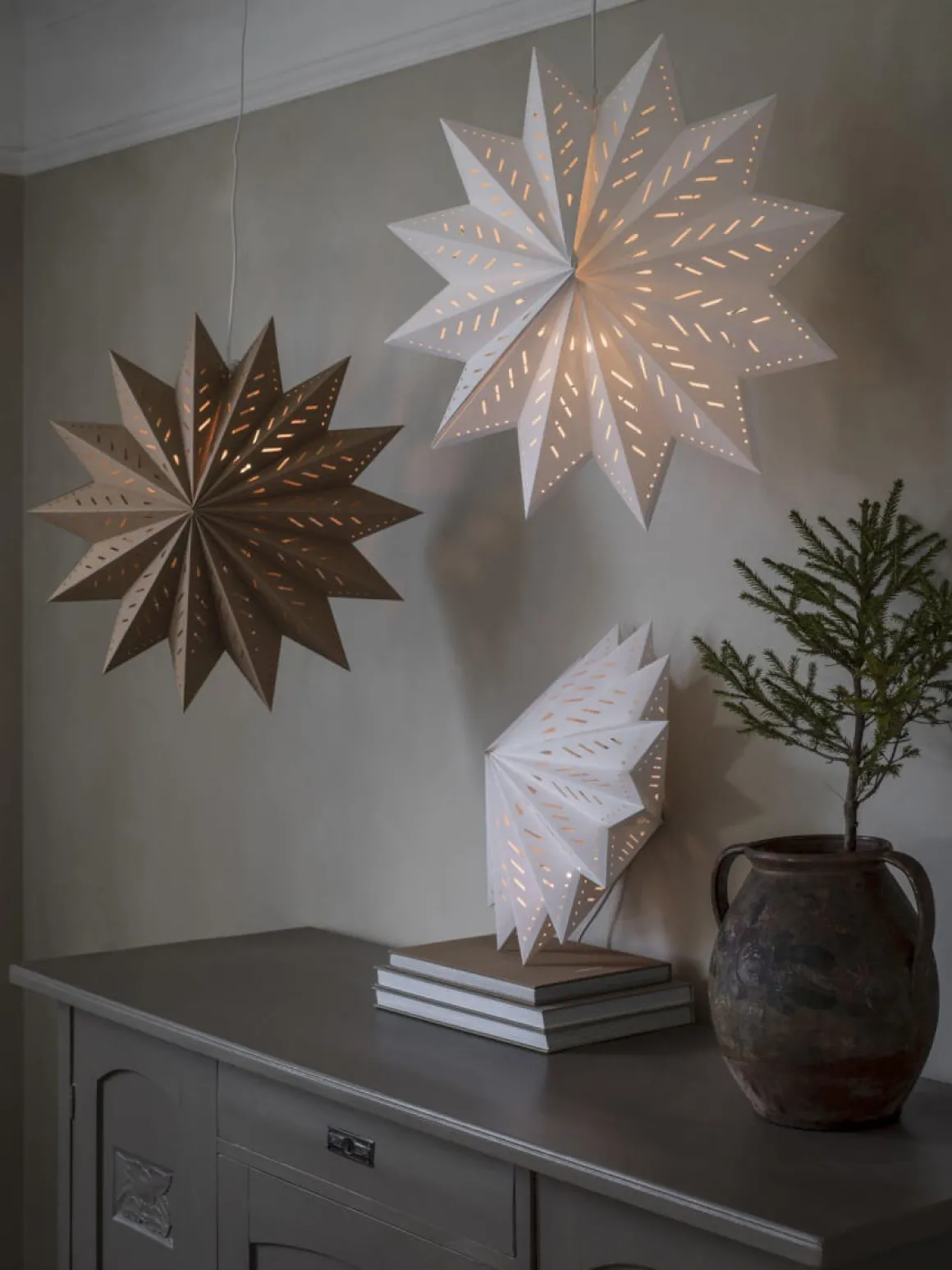 Julstjärna i Vitt papper av en lite kraftigare/tåligare kvalitet med stansade hål som släpper igenom ljuset på ett vackert sätt. Stängs med snöre och snörstopp. Glöm inte köpa till E14 sladdställ och ljuskälla, max 25W.