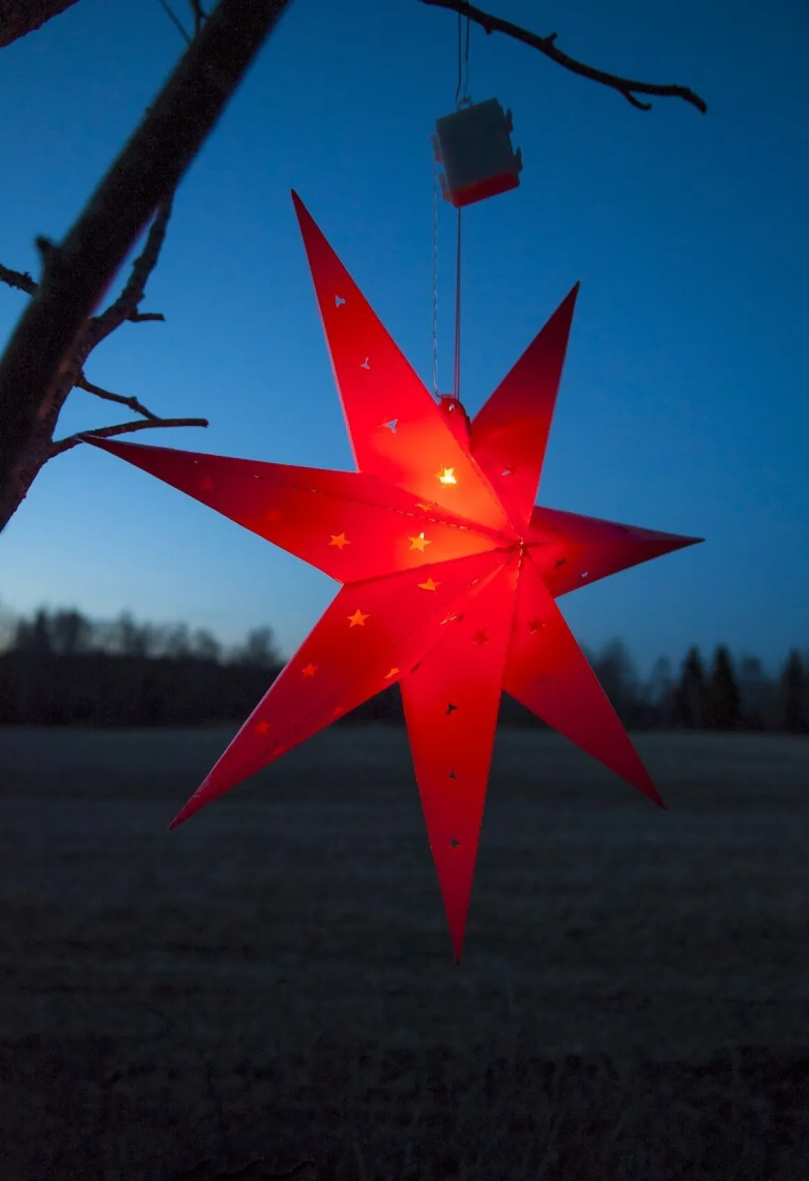 Finns det ingen stjärna som är godkänd att ha ute? Jovisst gör det ! Här har du henne, vackra Alice går alldeles utmärkt att pynta med både inomhus och utomhus. Hon drivs med batterier och har givetvis en inbyggd timer så du enkelt kan ställa in när du vill att hon ska lysa. Här ser du Alice i röd.