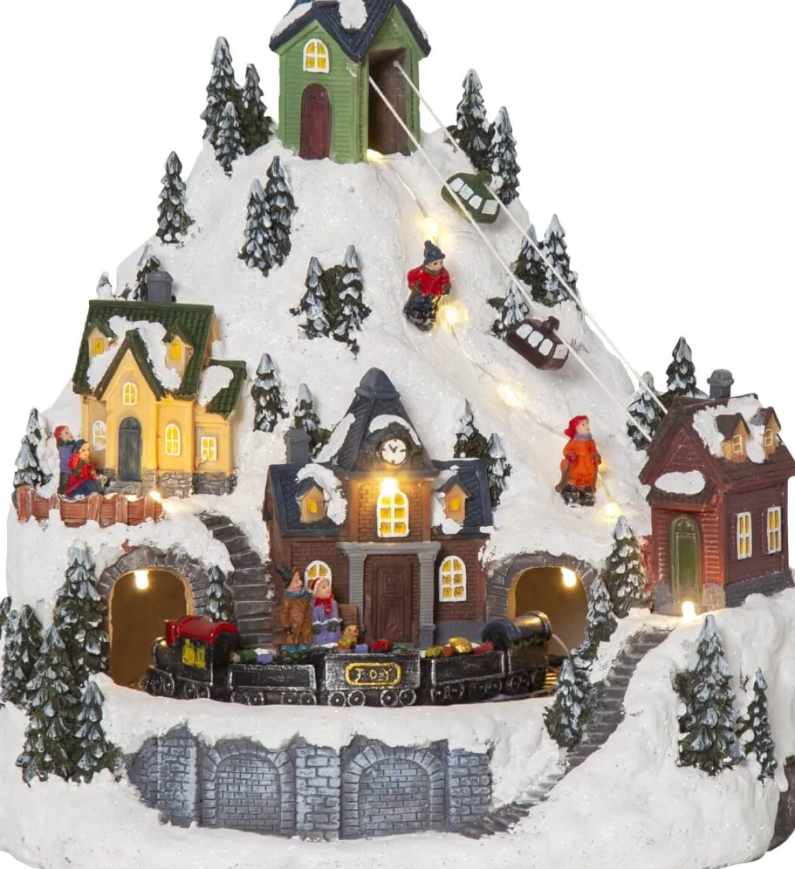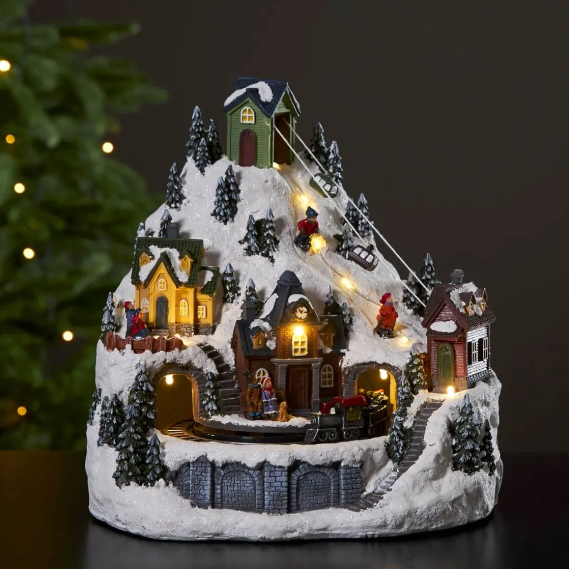 Så härlig juldekoration med vinterlandskap, linbana, skidåkare och tågstation från Star Trading. Det lyser fint i snön och vid stationen av små varmvita led lampor. Tåget roterar. Dekorera till advent och jul och få en härlig julkänsla som passar både barnrummet och på en hylla eller skänk.
