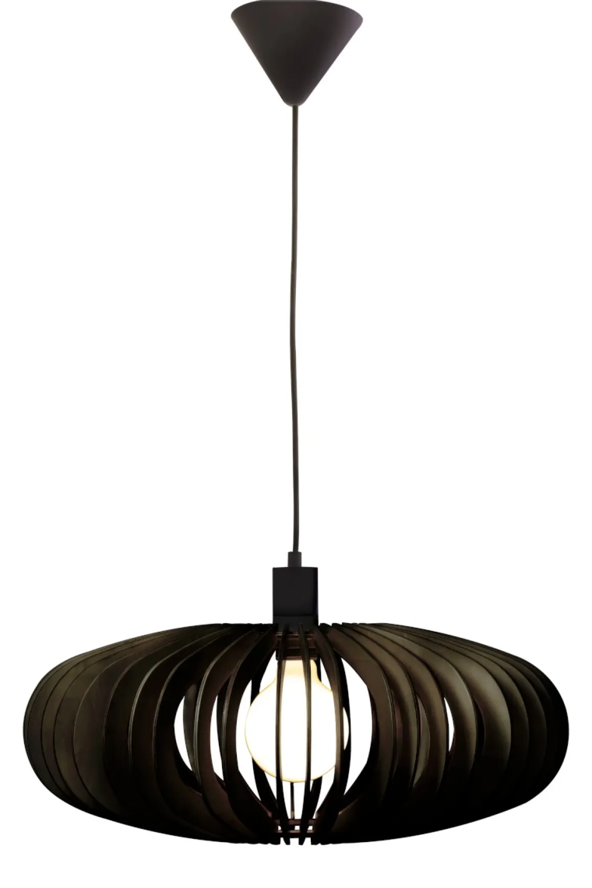 Arcos är en vacker svart taklampa från aneta belysning med ett härligt ljusgenomsläpp med vackert skuggspel. Arcos är en relativt stor lampa som ändå tar lite plats då den är så luftigt byggd av lameller i tunn plywood.