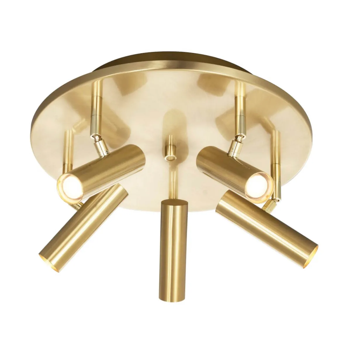Kolla in coolingen! Vi bara älskar Artic serien från Aneta. En serie med stilrena spotlights med ordentligt med ljus och krokupphäng för en snabb och smidig installation. Artic finns i en rad olika modeller så kika gärna runt på de olika tills du finner rätt modell för dig. Stilren slimmad design med 6W Led i varje spot med en ljustemperatur på 3000K och 540 Lumen per ljuskälla. Här ser du Artic i vad vi kallar för en rondell, det vill säga en rund bas mot taket i mattmässing med hela 5 riktbara huvuden.