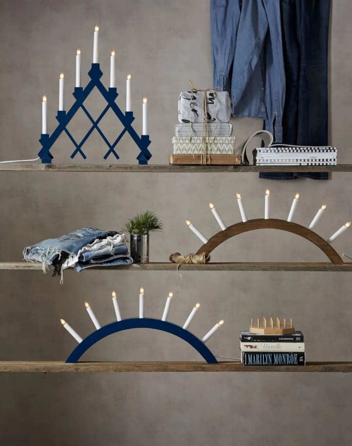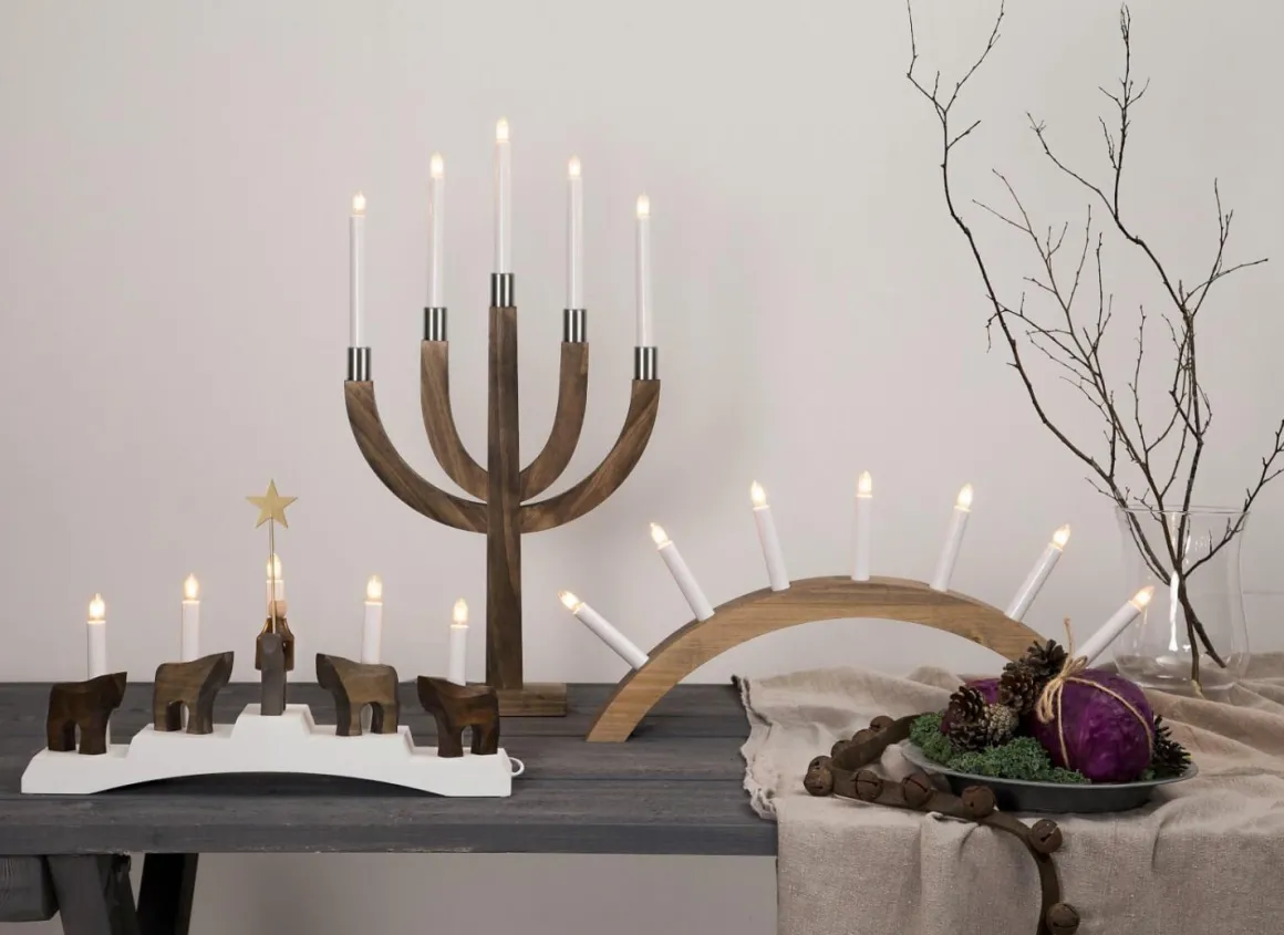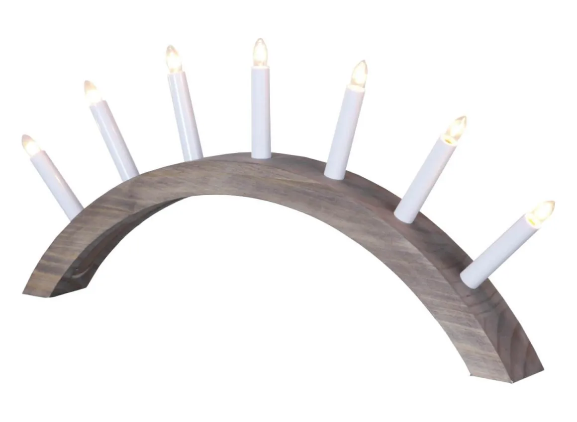 Brun stilren träljusstake med 7 ljuskällor från Star Trading. Ljusstaken är formad som en båge och ger ett elegant intryck i rummet. En dekorativ adventsljusstake som sprider julstämning i hemmet.