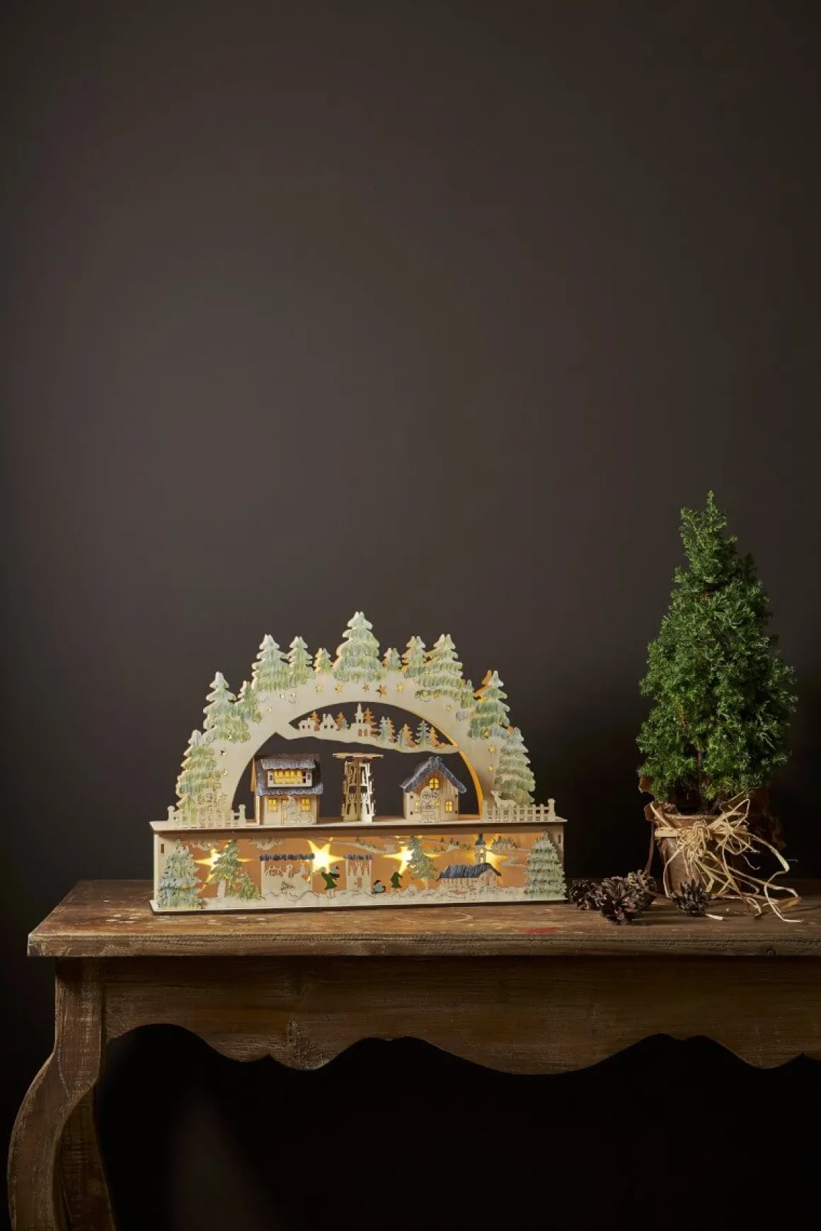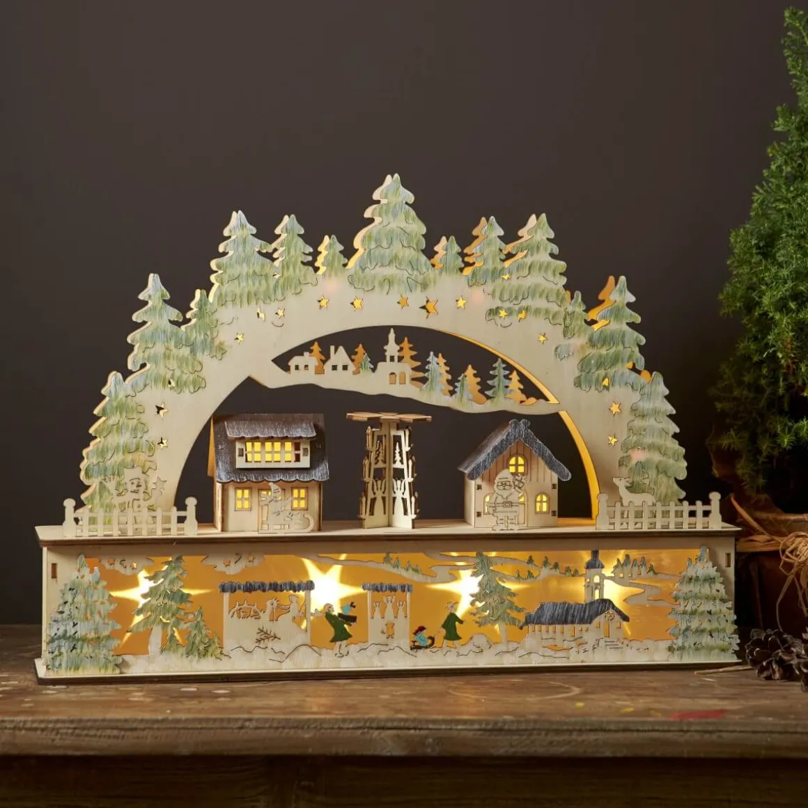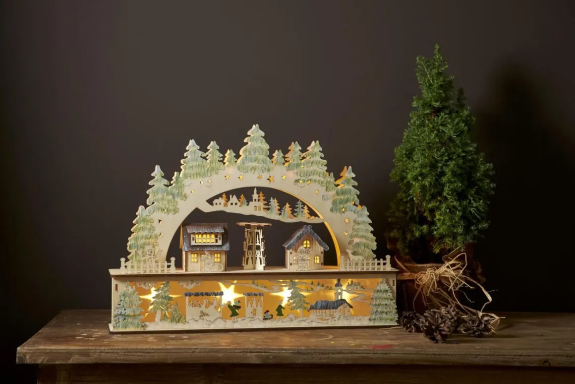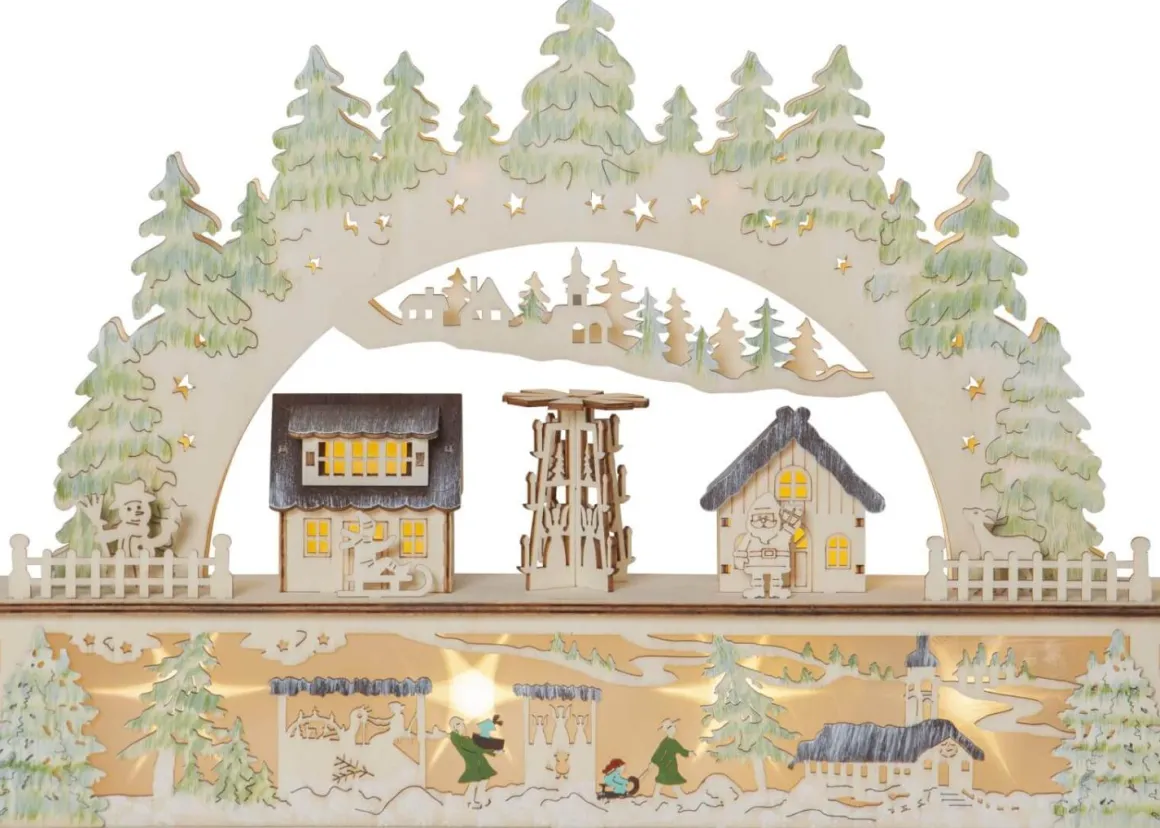 Vacker, detaljrik laserskuren träljusstake från Star Trading. Basen har ett vackert utskuret landskap med små hus och ovan på basen böjer sig en båge med granar för att rama in den lilla detaljrika byn. Bamberg är i stort omålad men har ett par detaljer målade i ljus grön färg.