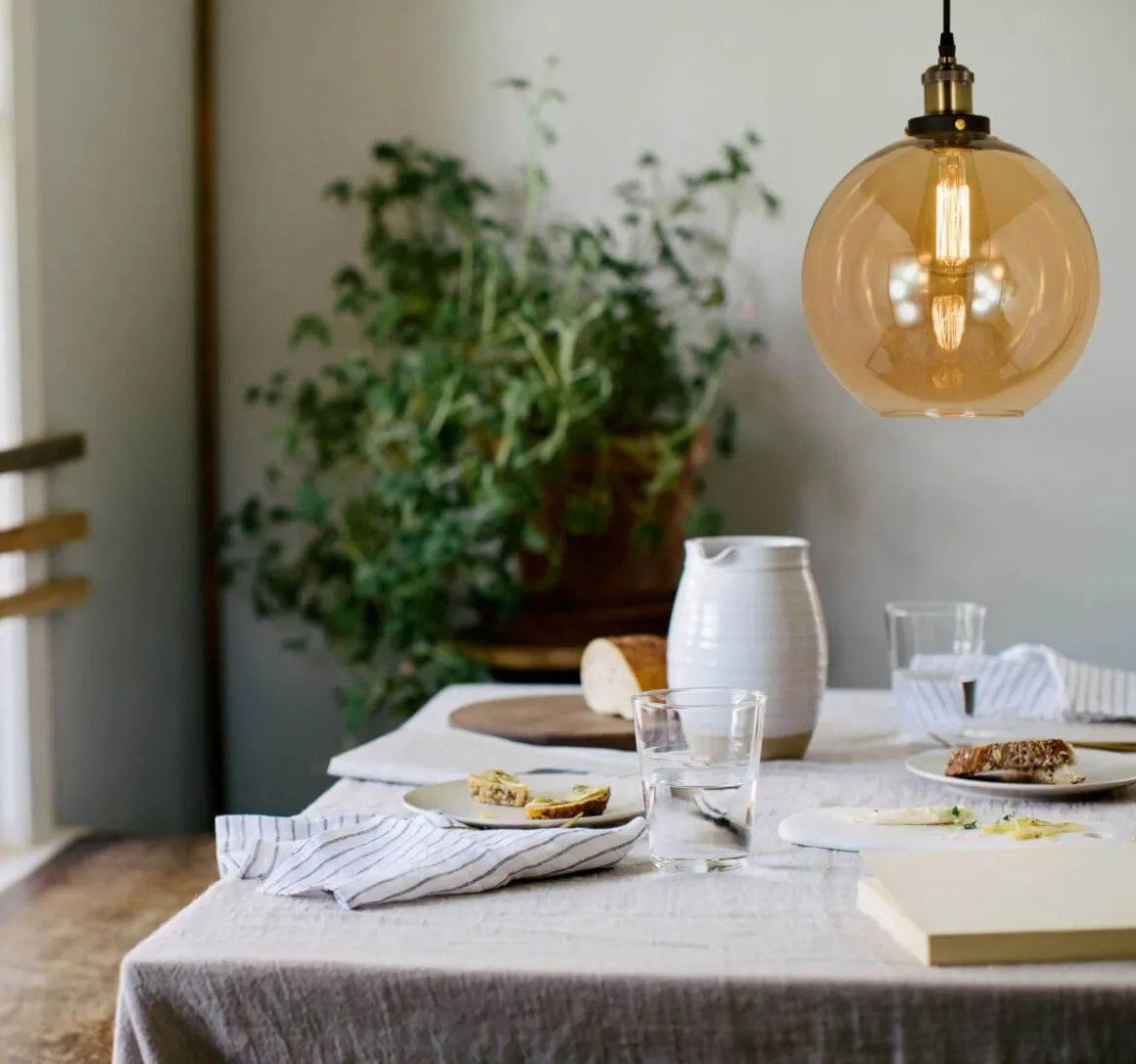 Härlig taklampa från Aneta med ett stort klotformat amberfärgat glas som ger ett mjukt och mysigt ljus, självklart med krokupphäng för en snabb och smidig installation.