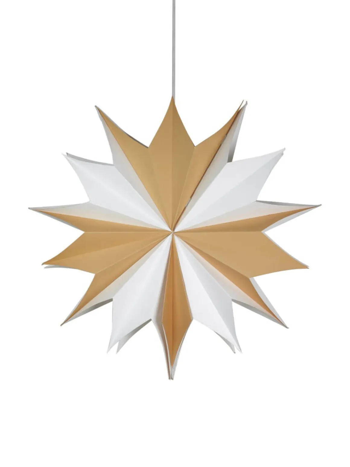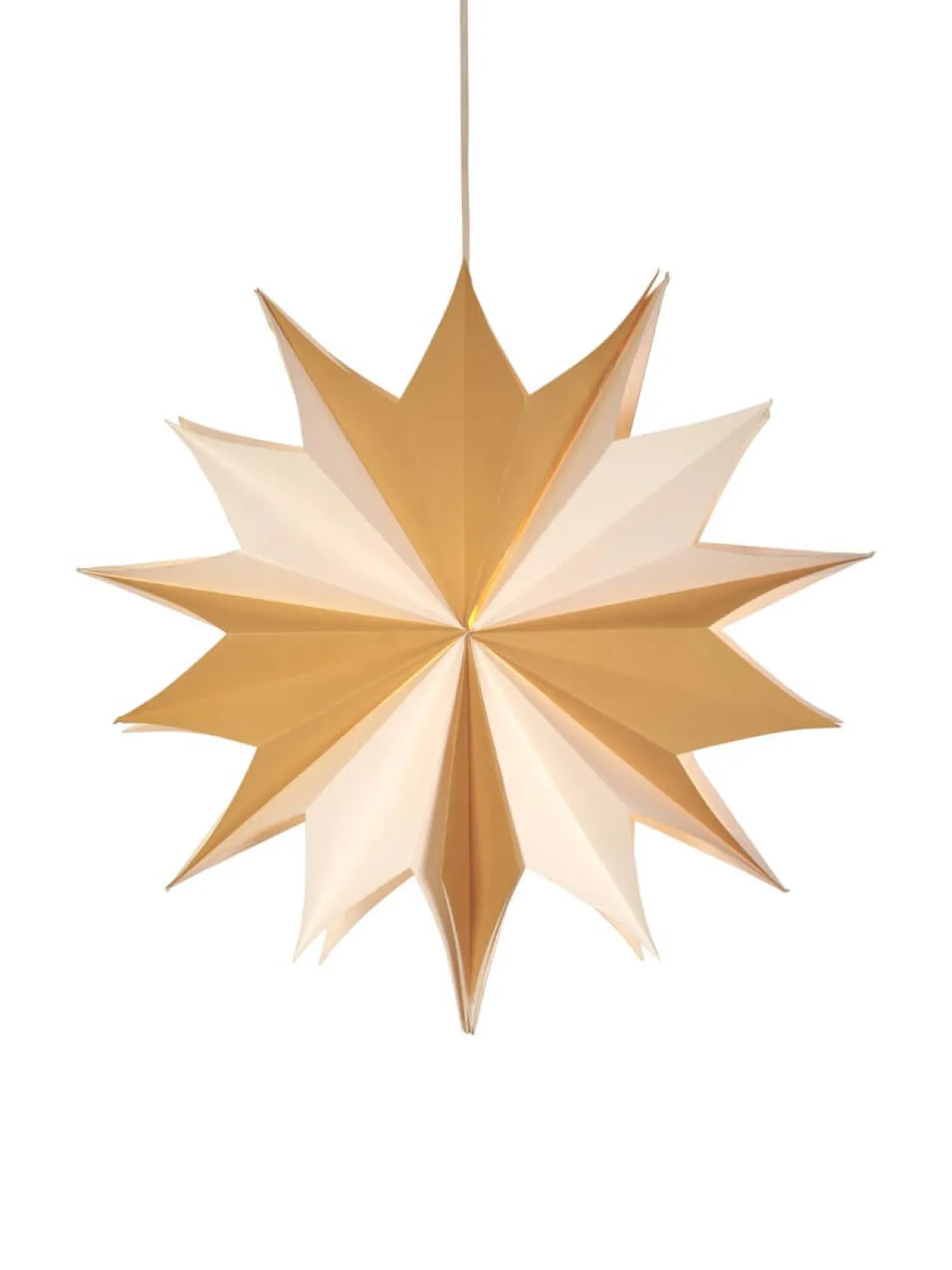 Julstjärna från PR-Home i papper av en lite kraftigare kvalitet med stansade hål i den inre stjärnan som sprider ljuset på ett vackert sätt. Stängs med kardborre och knytband.