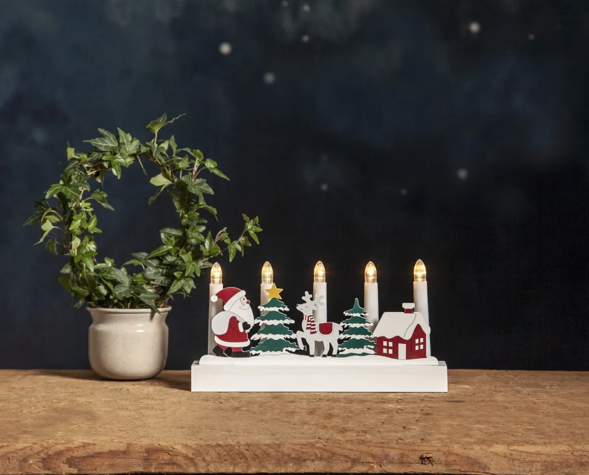 Billy är en liten batteridriven adventsljusstake från Star Trading med laserskuret motiv framför ljuspiporna. Tomte, ren och hus. När Billy är påslagen lyser det fint i de fem ljusen.Perfekt dekoration till advent och jul, placera ljusstaken i ett fönster eller på en hylla för att få den perfekta julkänslan.