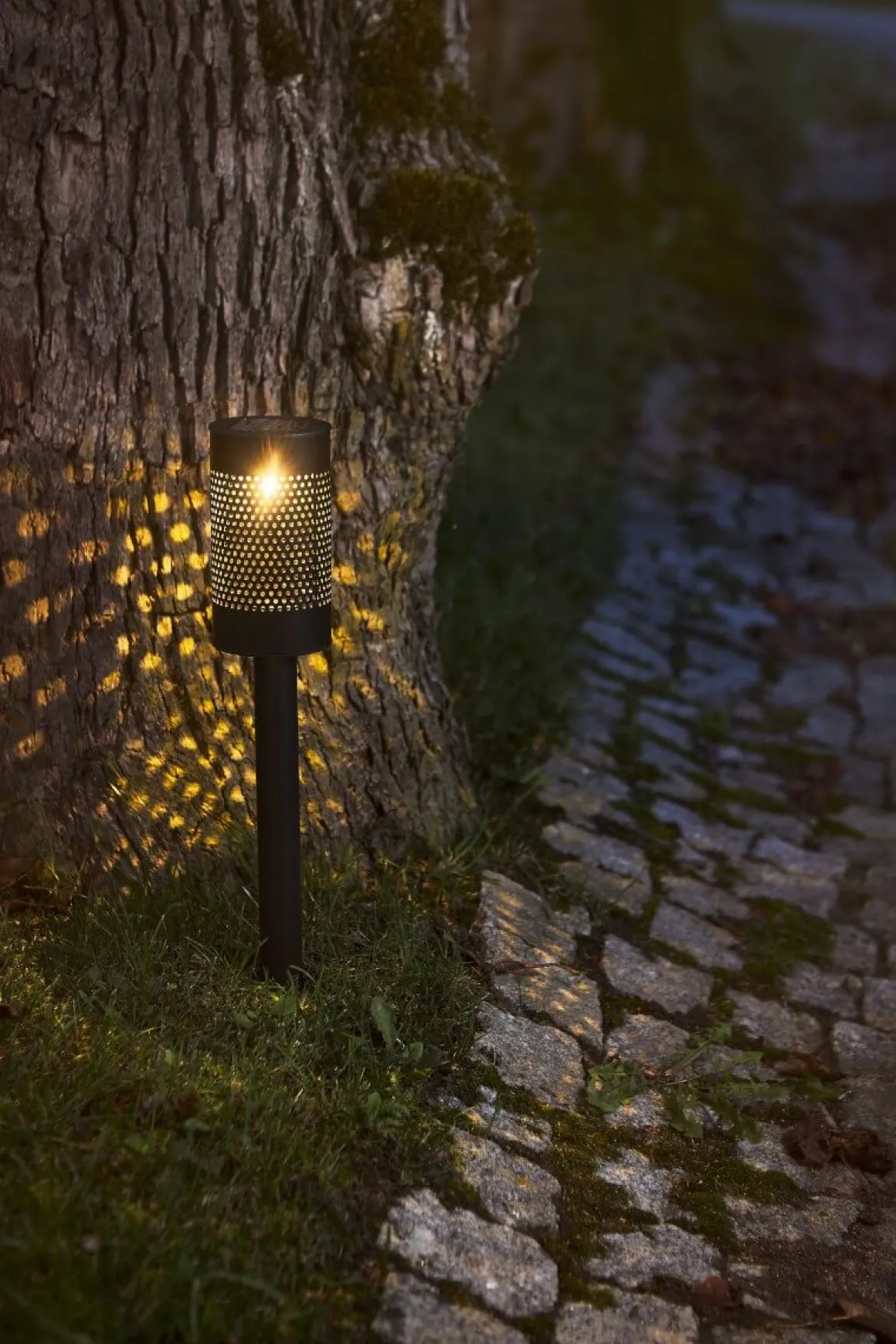 Diskret och stilren solcellslampa från Star Trading som ger ett härligt sken genom den laserskurna metallen när mörkret kryper på.